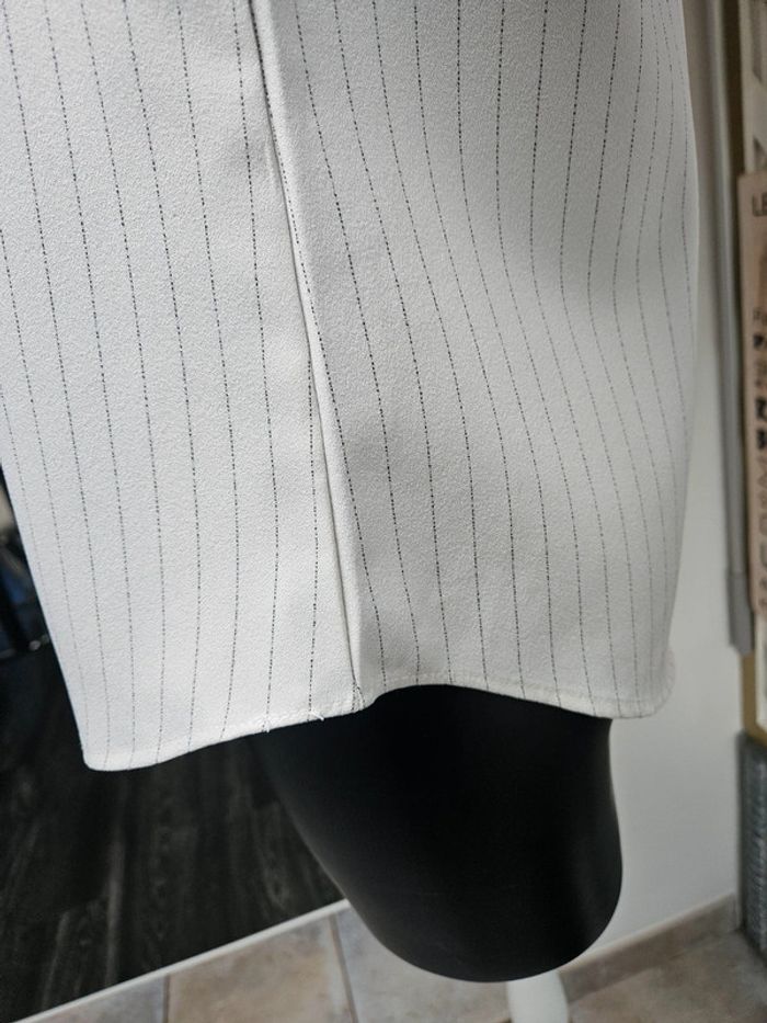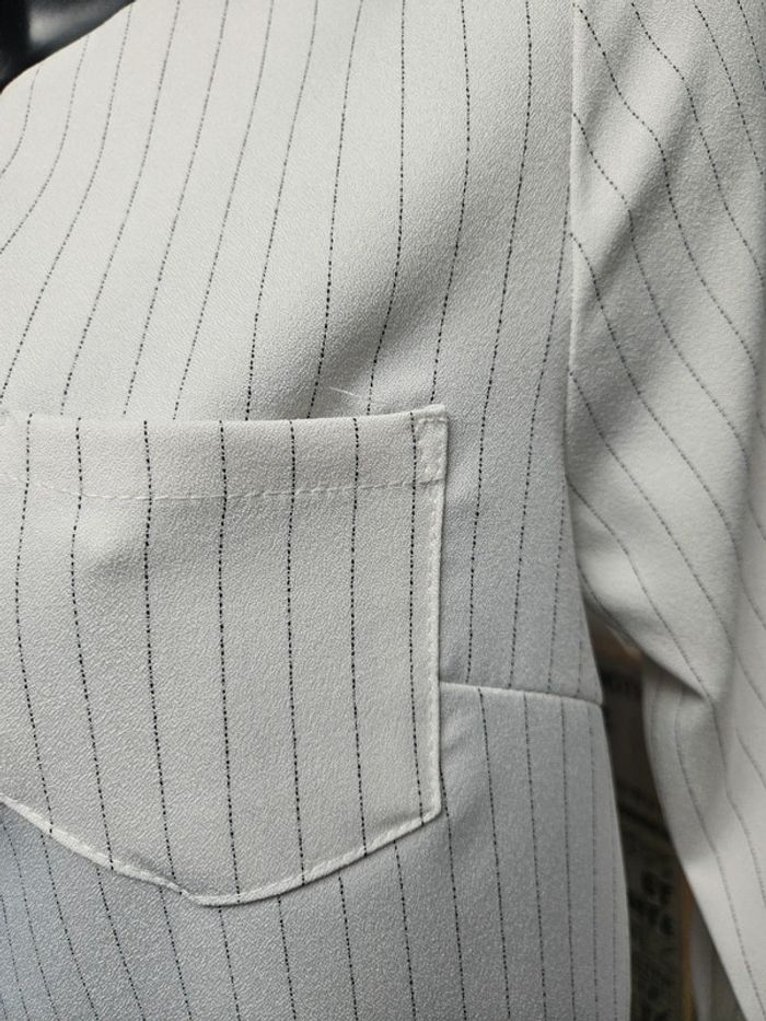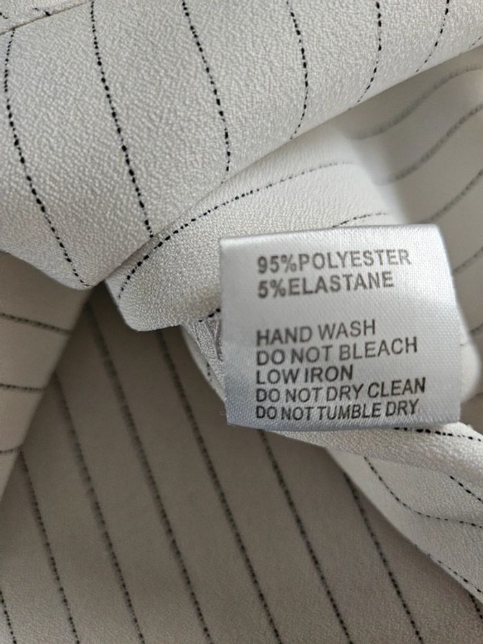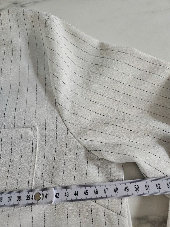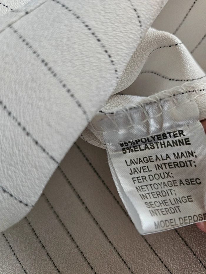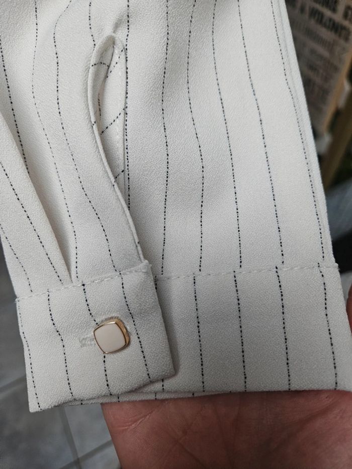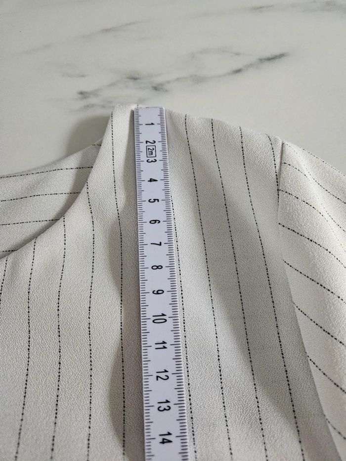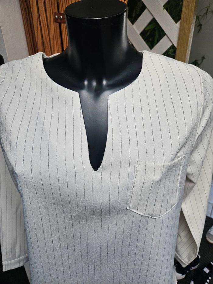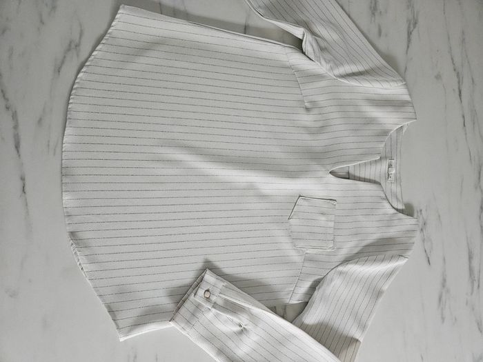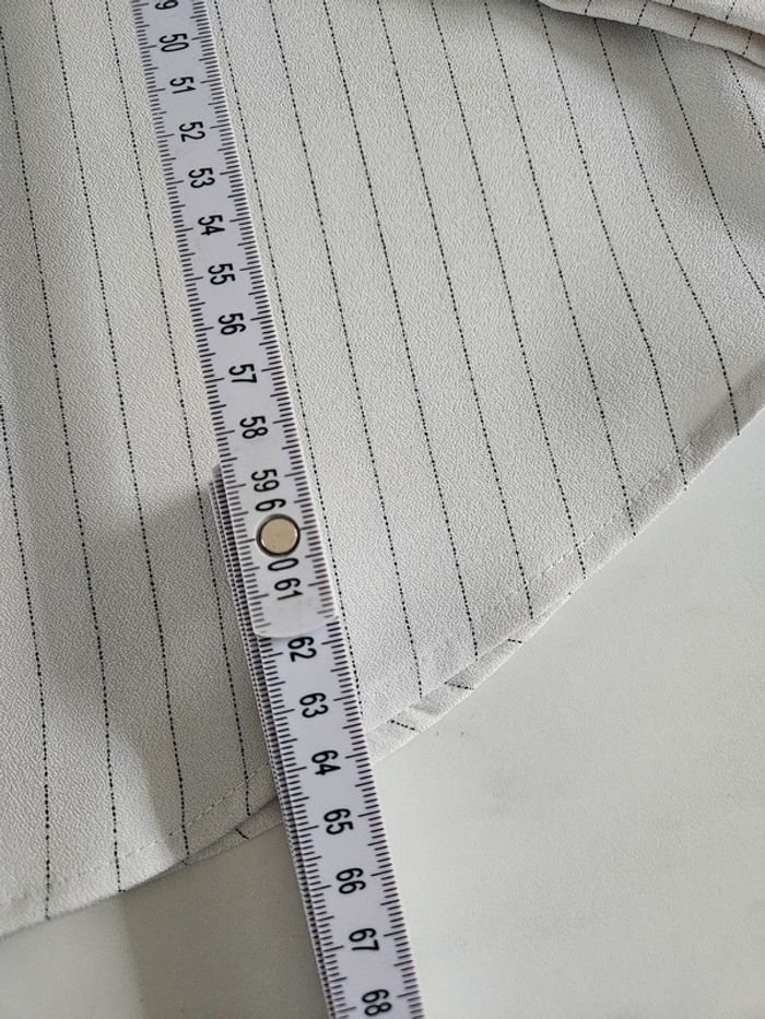 Blouse style chemisier à lignes en parfait état. Matière un peu crépon et les dimensions se trouvent sur les photos
