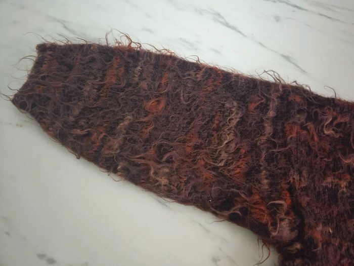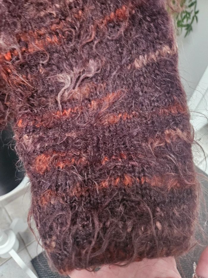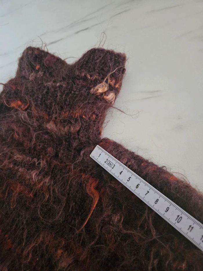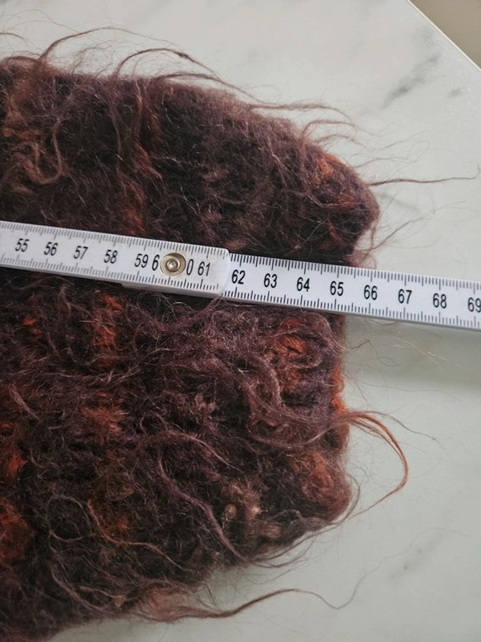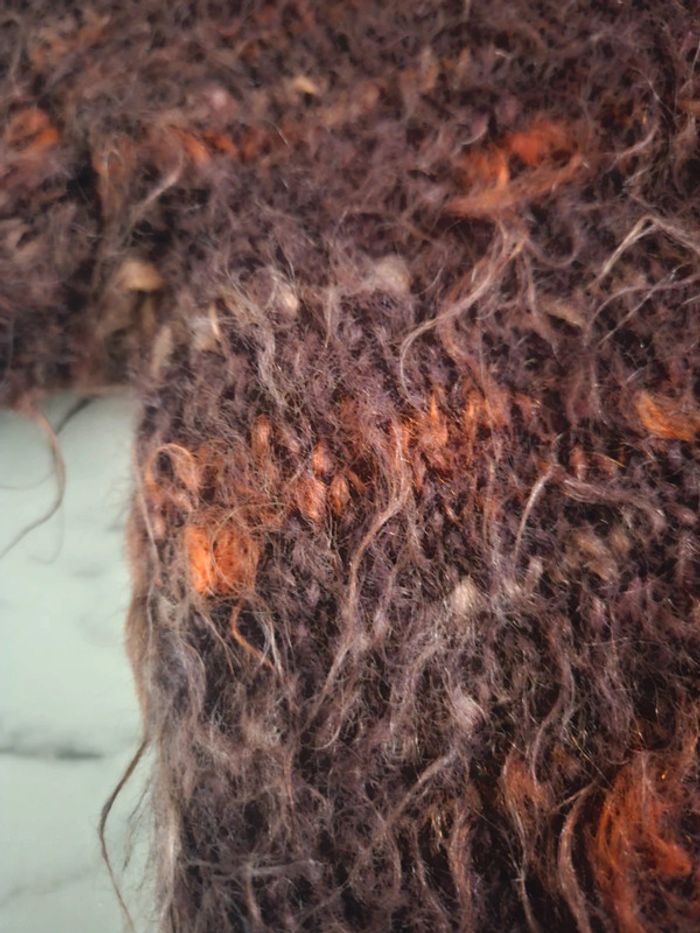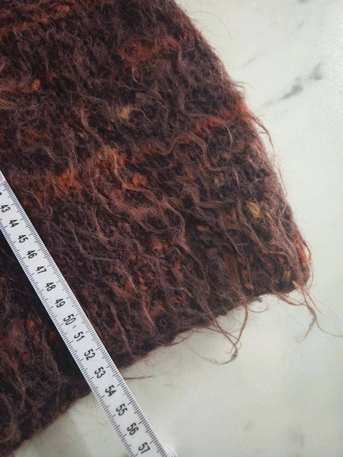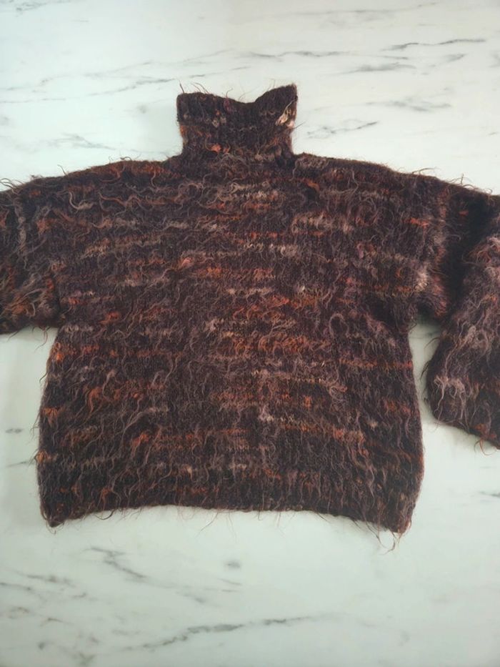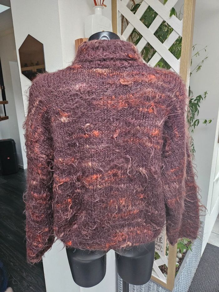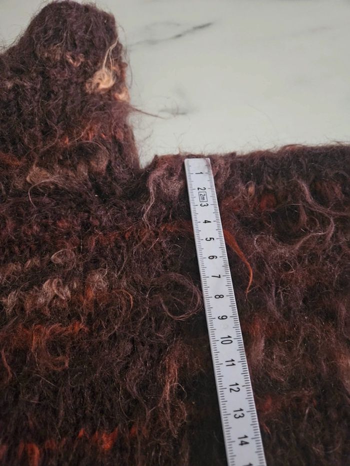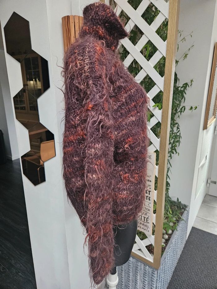 Marron avec une pointe de rouille. Il ne possède aucune étiquette mais c'est un pull véritablement en laine et bien chaud. Les dimensions se trouvent sur les photos et correspond à une taille L. Super original