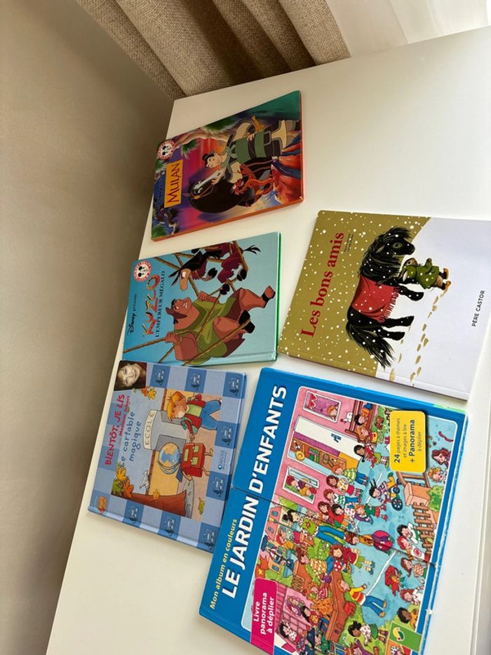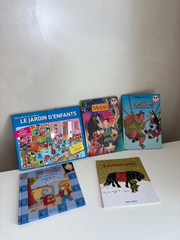 Lots de livre Kuzco l’empereur mégalo, deux petits points Disney, Mulan, points Disney, Les bons amis, deux petits points père Castor, Le cartable magique deux petits points bientôt, Julie Mon album en couleur le jardin d’enfants