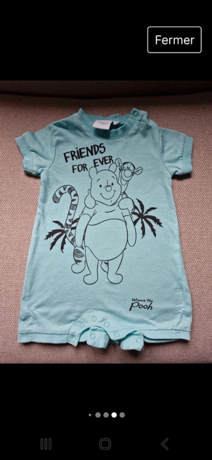 #manouwgarcon3mois Bodie bébé garçon, manches courtes, 100% coton, dessins winnie l ourson, couleur bleue ciel, taille 3 mois. Marque disney Très bon état, les pressions sont nickels.