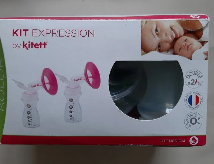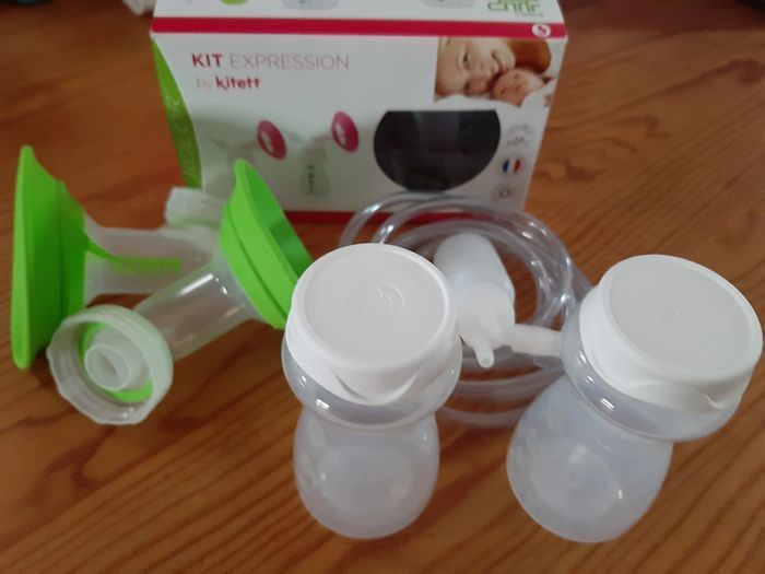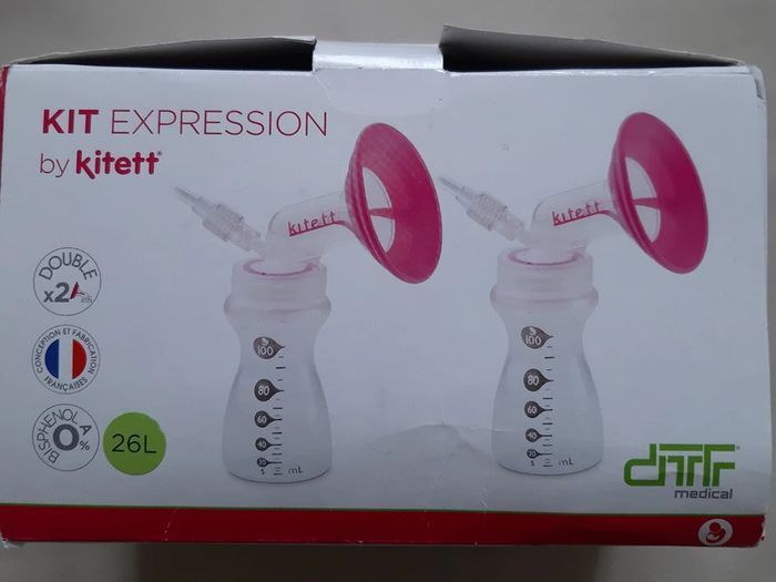 Kit d'expression complet, double, pour tire-lait électrique, de la marque kitett Taille 26 mm L couleur vert 2 téterelles 2 flacons 2 bouchons à vis 1 flacon de sécurité 2 tuyaux Acheté neuf en pharmacie. Peu servi car j'ai dû arrêter l'allaitement au bout de 2 mois. A servi pour essayer de stimuler la montée de lait... Peut être stérilisé. Vêtements de la taille naissance à la taille 3 ans disponibles. Jouets et livres pour bébé et enfants disponibles.