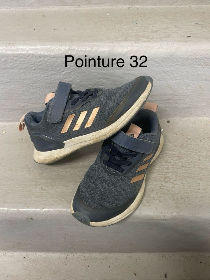 Baskets pointure 32 adidas Portées mais restent en bon état Voir photos pour les défauts esthétiques Manque semelle fine adhésive partie au lavage