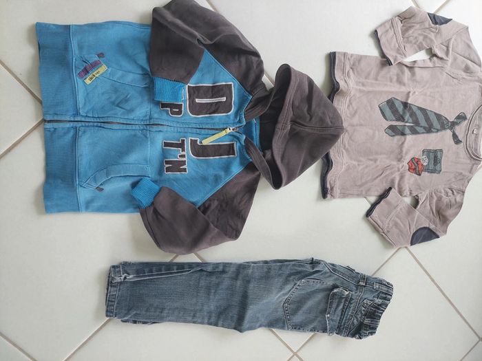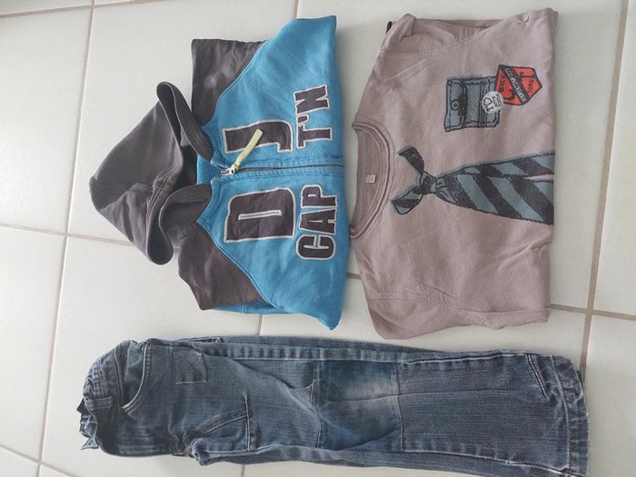 Lot Capt'n Tortue de 2 pièces et Jean Tout Compte Fait offert. Le lot se compose comme suit : * Polo manches longues Capt'n Tortue en taille 110. Très sympa ; une fausse cravate imprimé 👔 ! * Sweat à capuche Capt'n Tortue en taille 116 * Jean bleu Tout Compte Fait 7 ans offert N'hésitez pas à jeter un coup d'œil à mes autres ventes pour faire un lot à petit prix ! Remises automatiques pour les lots. #reductionsurleslots #lotapetitprix #offert