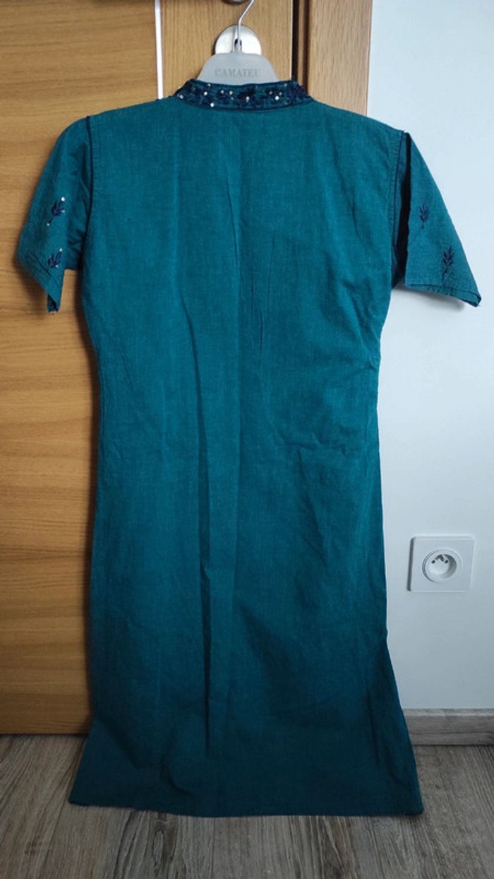 Robe verte, brodée. Mesures : - taille 40 - épaules 36 - hauteur 95
