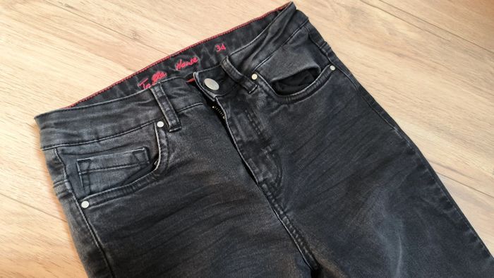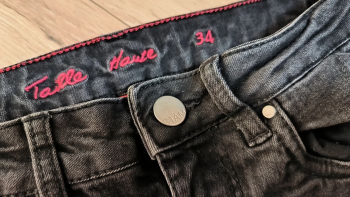 Jean Etam, noir, taille haute, slim, bouton et fermeture éclair, taille 34, tbe N'hésitez pas à regarder mon dressing, remise activée pour l'achat en lot