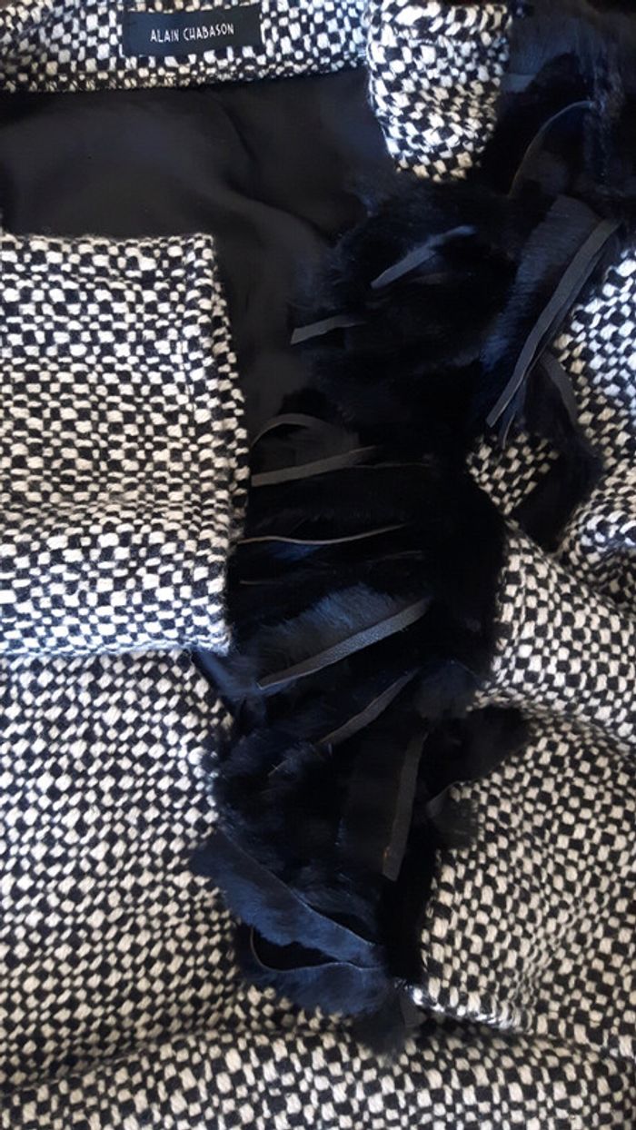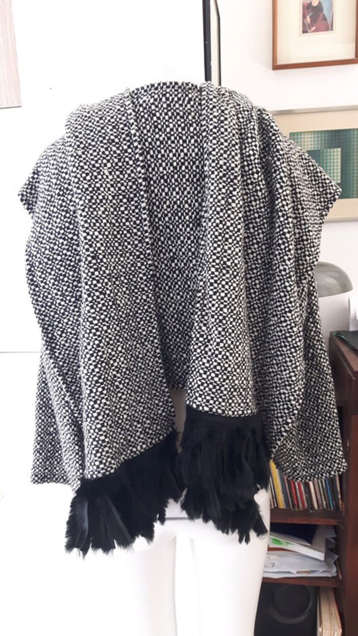 Original et vintage, manteau cape poncho en laine avec pour fermeture deux grands pans à rabattre sur les épaules comme une écharpe. Noir et blanc, chic, avec lanières de cuir et fourrure en guise de frange au bout des deux pans, manches larges. Marque Alain Chabason, taille du 38 au 42.