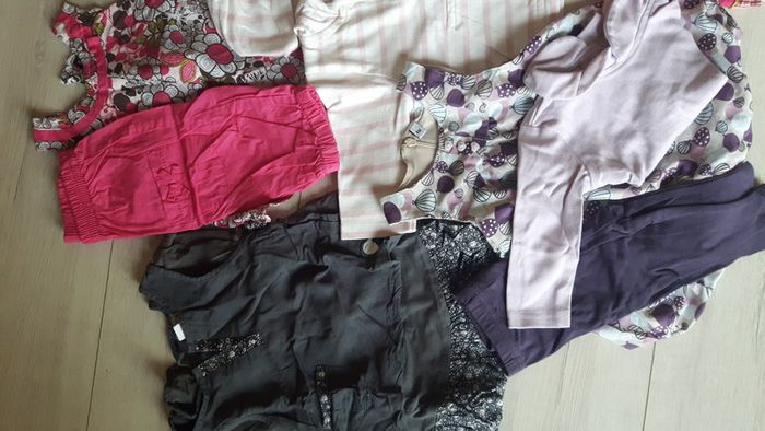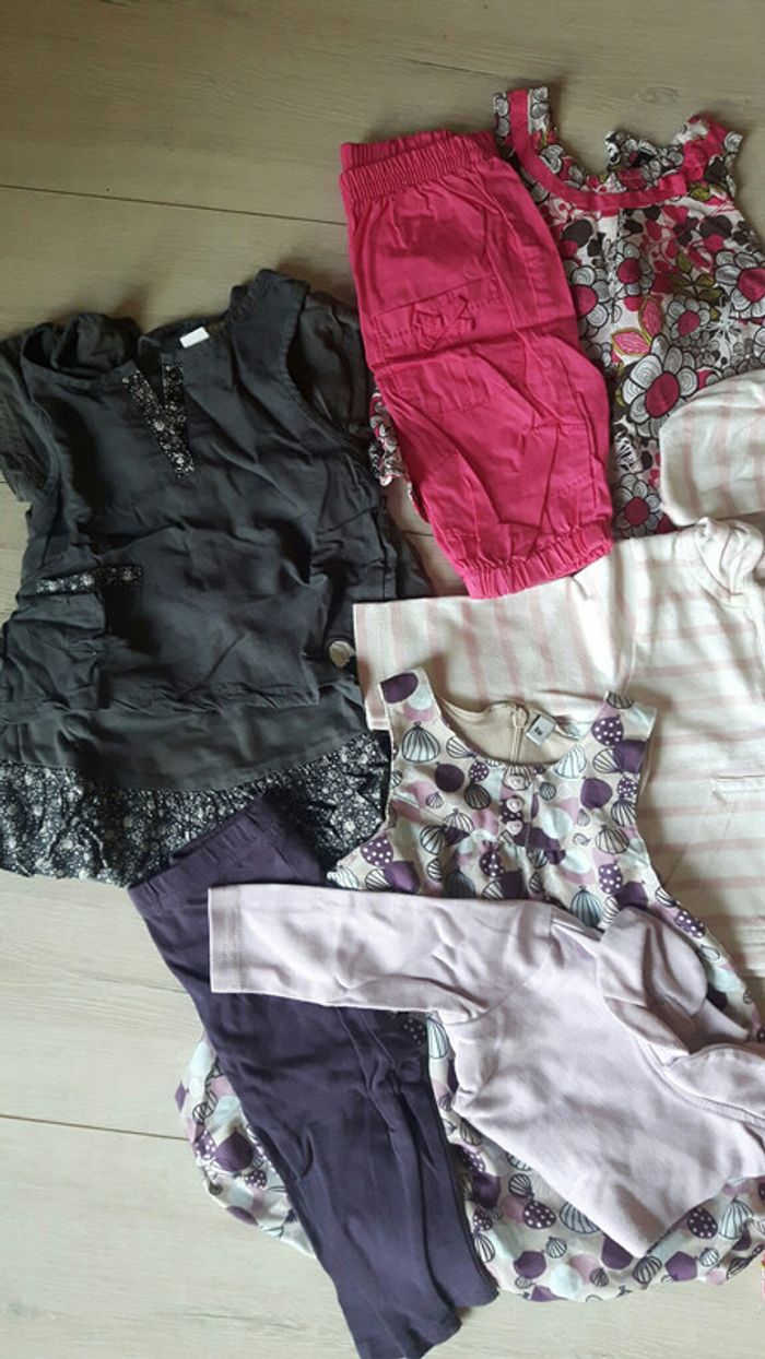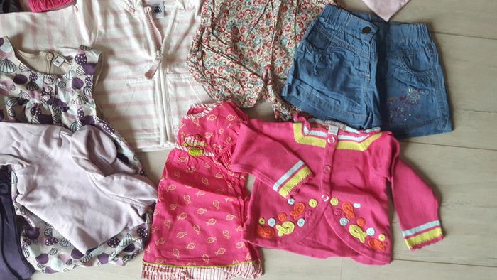 Lot 15 pièces fille été 6 mois : 1 robe grise Orchestra, 1 robe avec tee shirt manches longues et leggings assorti tons violets, 1 robe rose et son gilet assorti Orchestra, 1 gilet rayé Petit Bateau, 1 ensemble débardeur pantalon ton fushia, 1 short bouffant bout'chou fleuri, 1 short jean souple grain de ble, 1 tee shirt rose ballerine avec brillants grain de ble, 1 chemise manches courtes Dpam tons orangés rouges roses, 1 tee shirt Z fushia, 1 tee shirt rose pâle Jacadi. Bon état a tres bon état. Je donne un sarouel rose avec légère tâche et un body marcel blanc jauni au col. N'hésitez pas à regarder mon dressing, une remise allant jusqu'à 30% s'applique pour l'achat en lot.