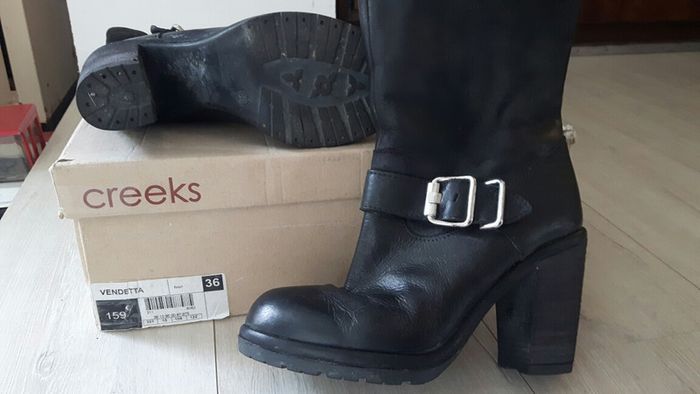 Très belles bottines Creeks en cuir noir, avec boucles, bout rond, à enfiler, talons 8 cm environ. Pointure 36. Bon état, portées environ 4 fois (trop haut pour moi!) Semelles extérieures impeccables antidérapantes. Boîte abîmée, scotchée. Achetées 159€, vendues 50€