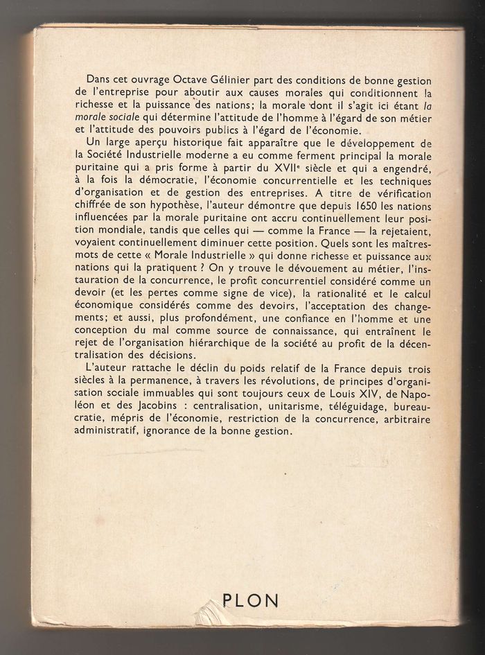 Octave Gélinier, Morale de l'entreprise et destin de la nation Bon état, Impact sur dos bas, légèrement jauni, bords frottés | Plon 1965, 20 cm, 397 p, couverture souple rempliée.