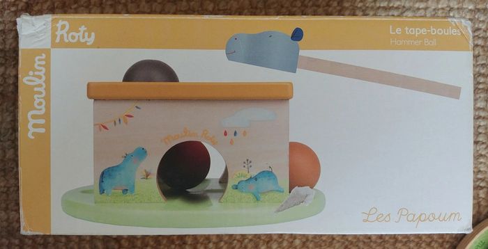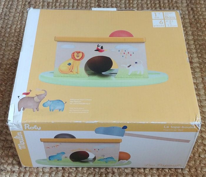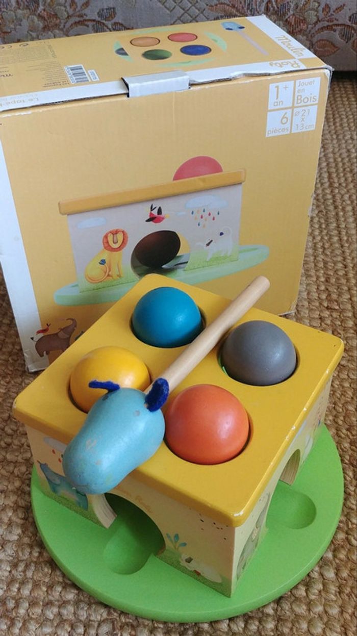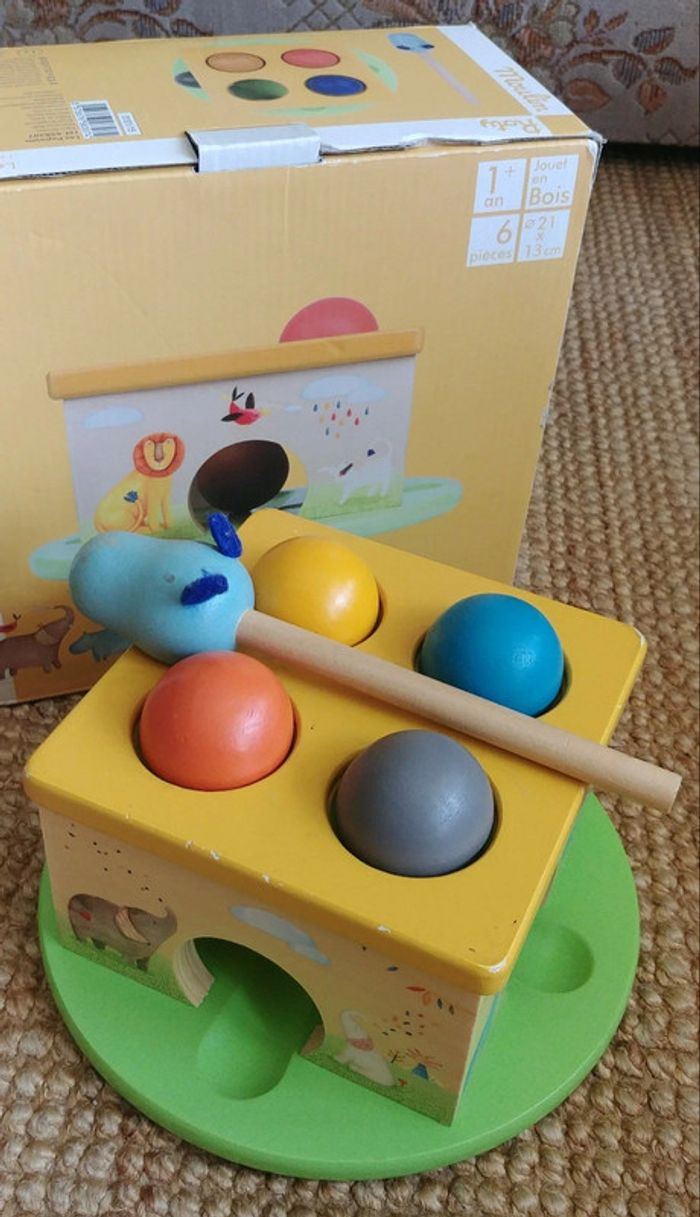 Ce jouet de boules avec un marteau est conçu spécialement pour les petites mains et est approprié pour une prise facile. Ce jouet de marteau peut aider l'enfant à développer la coordination main-œil, il peut améliorer leur dextérité et exercer leurs muscles en frappant la boule. A noter que les boules sont colorées et que l'ensemble est en bois illustré par des figures qui représentent des animaux. Le marteau a une tête bleue d'hippopotame.