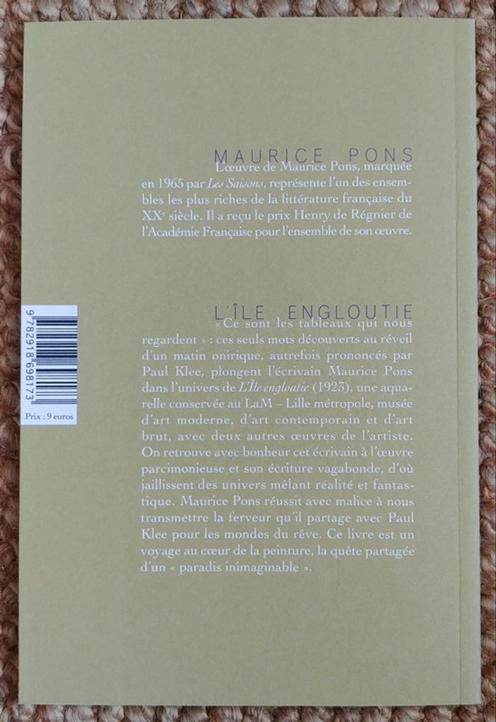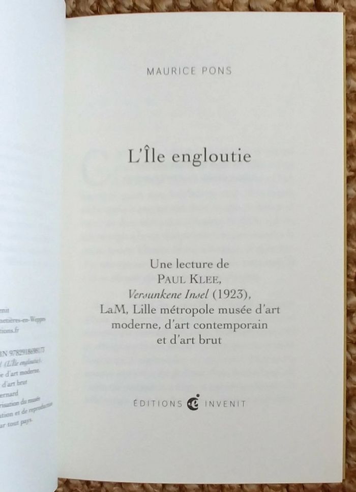 "Ce sont les tableaux qui nous regardent " : ces seuls mots découverts au réveil d'un matin onirique, autrefois prononcés par Paul Klee, plongent l'écrivain Maurice Pons dans l'univers de L'Île engloutie (1923), une aquarelle conservée au LaM - Lille métropole, musée d'art moderne, d'art contemporain et d'art brut, avec deux autres œuvres de l'artiste. On retrouve avec bonheur cet écrivain à l’œuvre parcimonieuse et son écriture vagabonde, d'où jaillissent des univers mêlant réalité et fantastique. Maurice Pons réussit avec malice à nous transmettre la ferveur qu'il partage avec Paul Klee pour les mondes du rêve. Ce livre est un voyage au cœur de la peinture, la quête partagée d'un " paradis inimaginable".