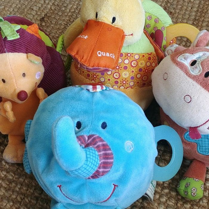 Albert l'éléphant découverte Lilliputiens. Dans le ventre rondouillard d’Albert se cache un petit livre illustré et coloré. Ouvre le et pars à la rencontre des habitants du cirque, ils ont une mine d’activités à te proposer! N'hésitez pas à regarder mon dressing car j'ai trois autres animaux en peluche/livres découverte Liliputiens à vendre également : Simon l'hérisson, Vicky la vache et Nicky le canard. Réductions sur les lots activées! Envoi uniquement avec Mondial Relay ou Collissimo, merci!