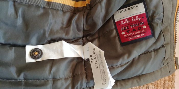 Grosse parka vert militaire TAO 12 mois. Portée quelques fois. Taille correctement. Bouton de rechange toujours attaché à l'étiquette. N'hésitez pas à regarder dans mon dressing car je mets en vente toutes les vestes, manteaux et autres tenues de cette période (principalement Catimini, IKKS, Moulin Roty et Petit Bateau). Réductions sur les lots activées. 😊 Envoi uniquement avec Mondial Relay ou Collissimo, merci!