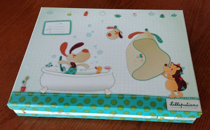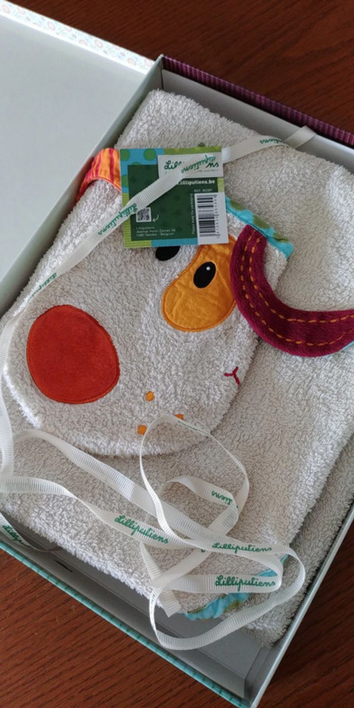 Lilliputiens - Cape de bain avec son gant assorti. Ensemble bébé Liliputiens modèle Jeff le chien comprenant la sortie de bain à oreilles et pattes brodées et son gant de toilette assorti. Douce et épaisse. Jamais utilisé, juste lavé une fois après achat puis la serviette a été oubliée dans sa boite. Envoi uniquement avec Mondial Relay ou Collissimo, merci!