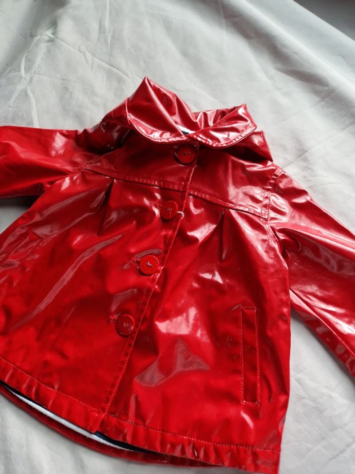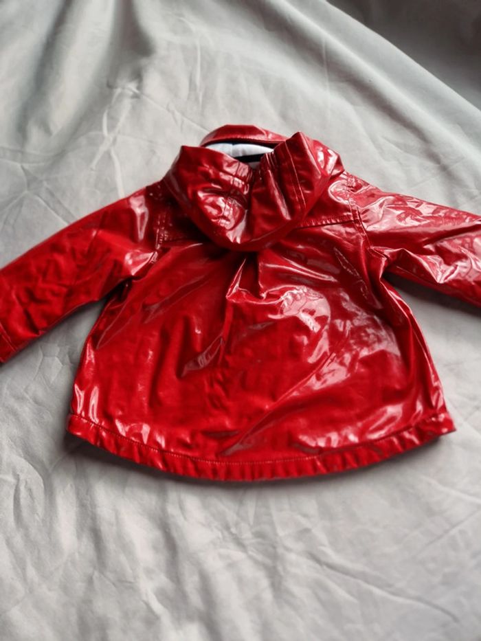 Ciré ,coupe vent, imperméable, rouge vernis,intérieur marinière, à capuche détachable, en très bon état 12 mois Demi saison #melo1410_manteau #melo1410_printempsete #melo1410_automnehiver #melo1410_12mois