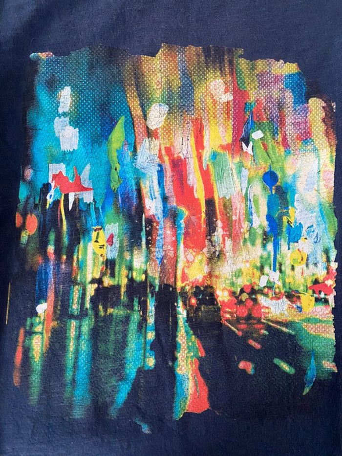 Tee shirt porté et lavé plusieurs fois qques traces d’usure mais reste en bon état. Pas de trous ni taches