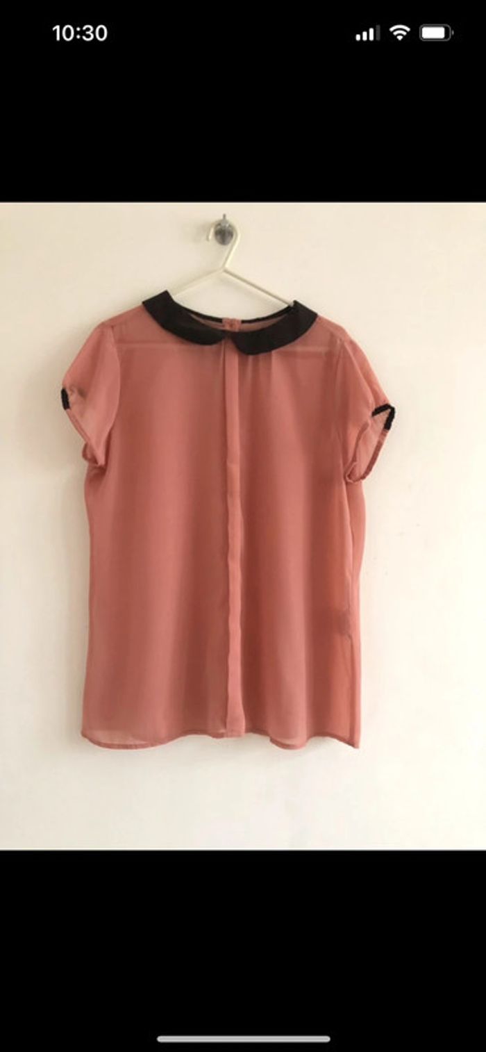 Blouse M manches courtes rose et col Claudine marron Très bon état