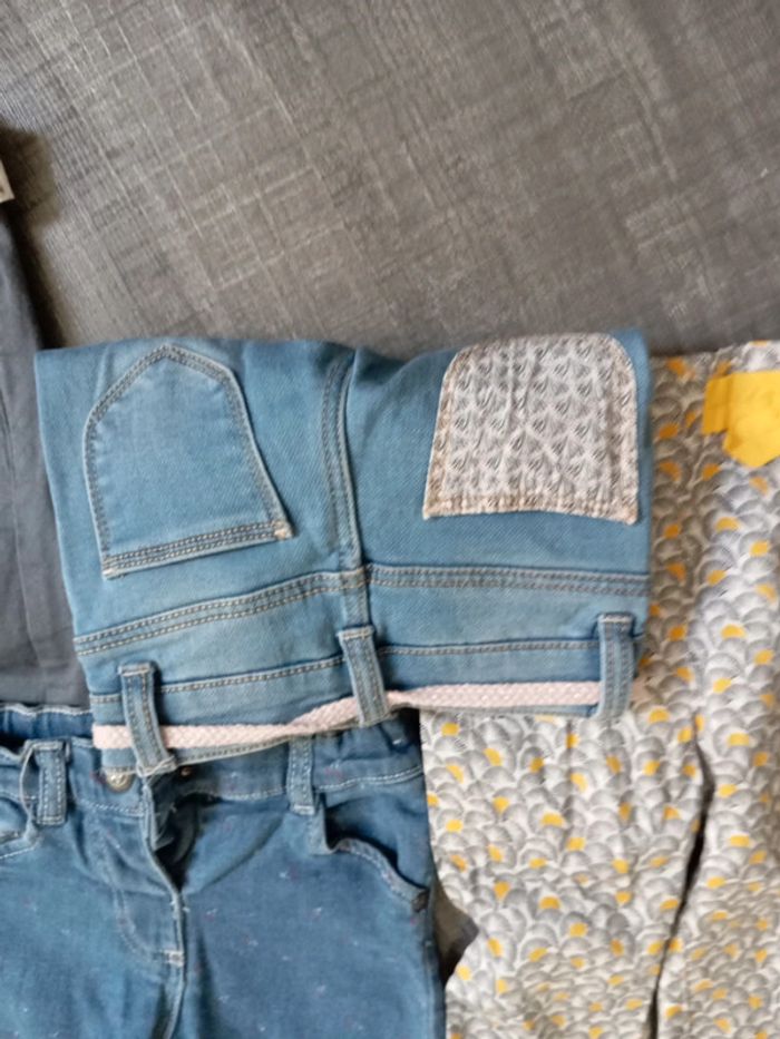 1 jean creeks poche fleuris + ceinture 1 jean tex motif cerise 1 pantalon jaune et gris Okaïdi 1 pantalon gris texturé ceinture a pois Okaïdi
