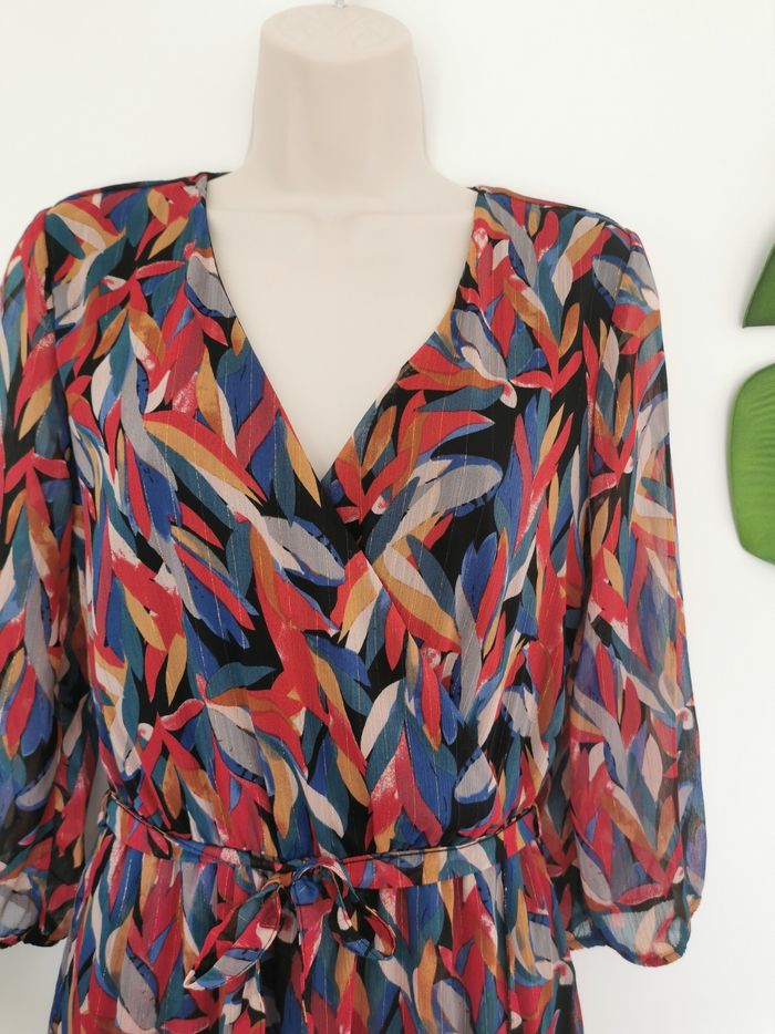 👗 ÉTAT DE L'ARTICLE: 10/10 ✅️ Avec étiquette🔖, jamais portée Robe 👗 multicolore 🙎‍♀️ La Halle Taille 38 • Matière: 100% polyester • Tissu voile, mousseline • Doublée ⚫ des épaules aux genoux sauf les manches • Décolleté en V effet cache-cœur ❤️ • Manches 3/4 bout élastiqué • Taille elastiquée avec ceinture amovible à nouer 🎀 • Jupe portefeuille • Rayures verticales dorées 🟡 metalisés ✨ • Imprimé multicolore 🟢🔴🔵🟠 effet feuillage 🍂 • 📏 Longueur: 114 cm • 📏 Mesure sous aisselles: 48 cm • 📏 Mesure épaules: 38 cm 💰Prix boutique: 35.99€ Parfait état👌, avec étiquette🏷️, jamais portée 🟠🟠