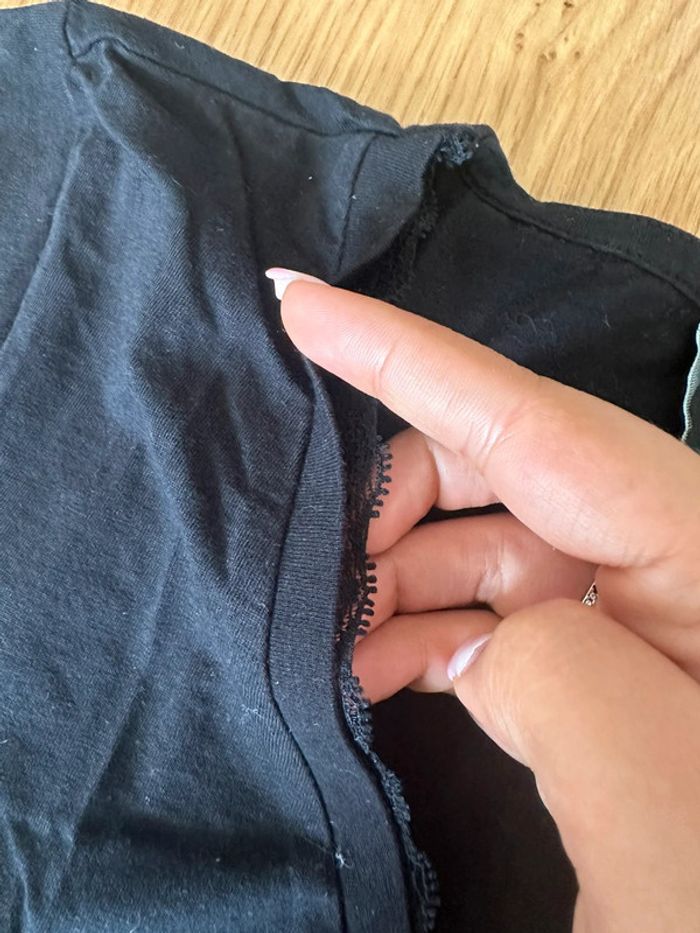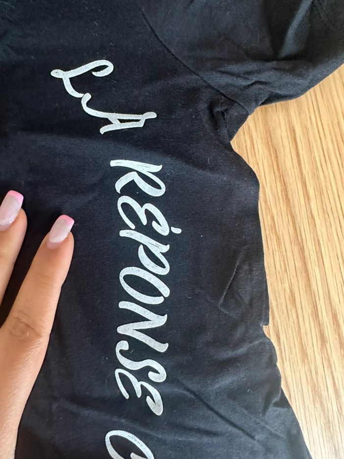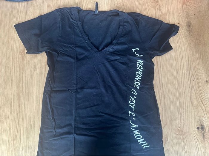 T-shirt noir manches courtes col V Marque Tiffosi Taille S Très bon état Détail en dentelle au niveau du col Écriture blanche « la réponse c’est l’amour »