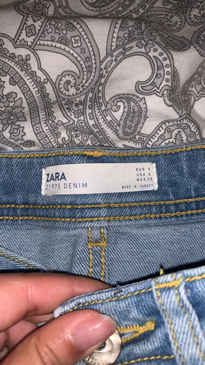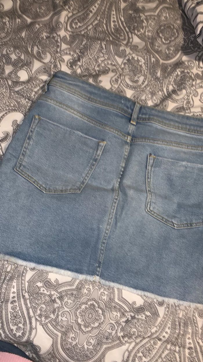 jupe en jeans Zara taille S effet déchiré en bas de la jupe une bande argenté et rouge de chaque côté