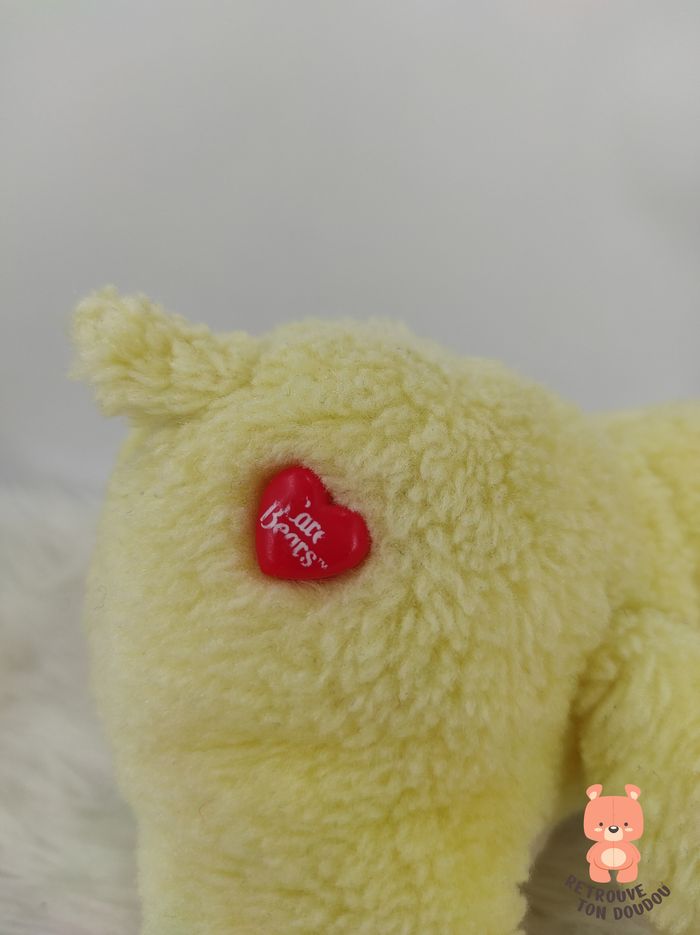 🧸 Petite Peluche Bisounours Jaune Grosgateau Vintage fin années 1980, Care Bears 📏 Dimension : 15 cm environ ✨ Occasion. Bon état général, étiquette tissu absente, inscription sur le cœur rouge légèrement effacée. 🧼 Passage vapeur 👀 Vous achetez le doudou que vous voyez sur les photos.