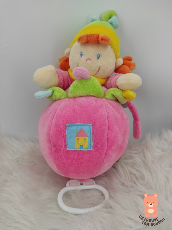 🎶 Doudou Boule boîte à musique rose avec maison d'où ressort une fillette lutine entourée de pétales de fleur vertes, Nicotoy 📏 Dimension : 30 cm environ ✨ Occasion, très bon état, musique OK 🧼 Lavé avec lessive hypoallergénique 👀 Vous achetez le doudou que vous voyez sur les photos