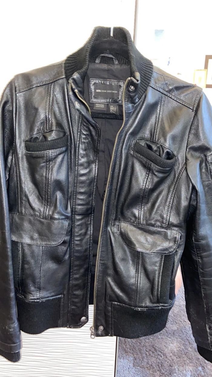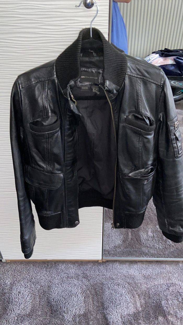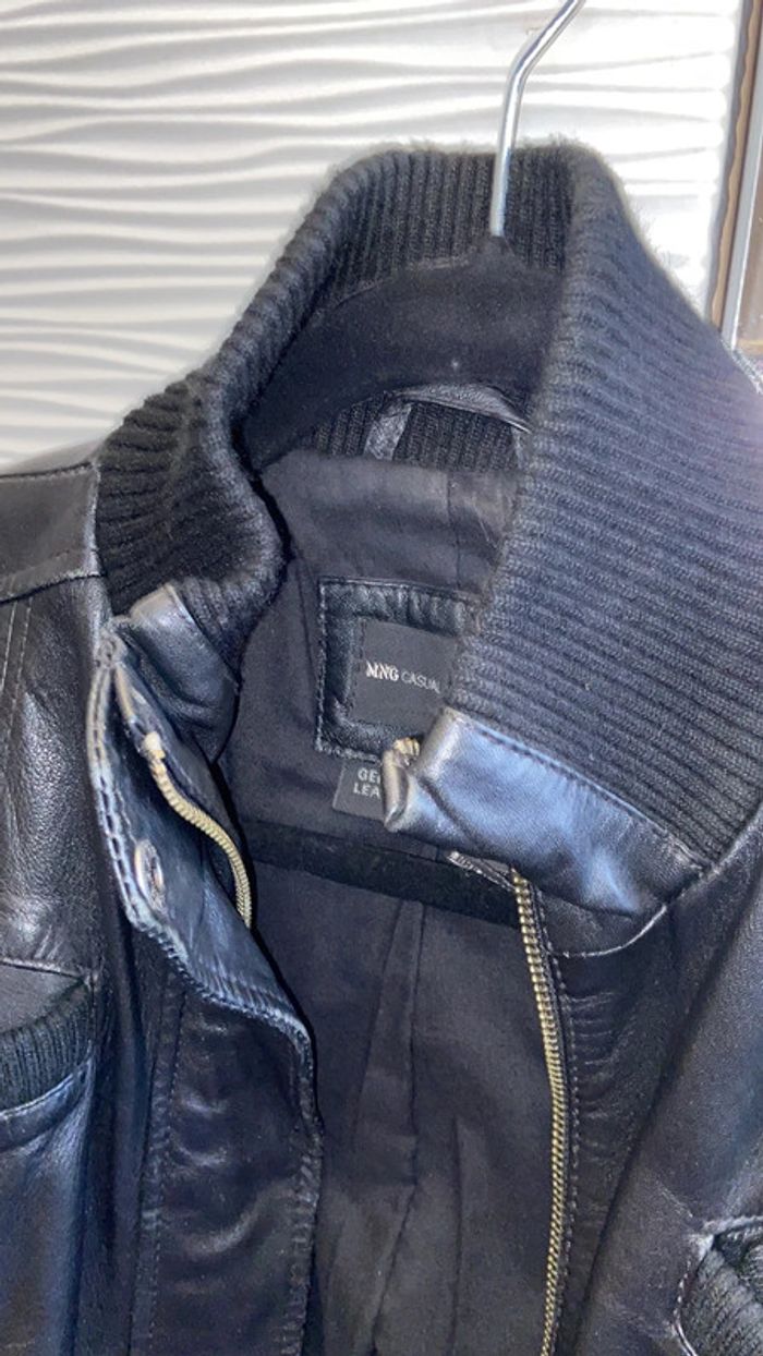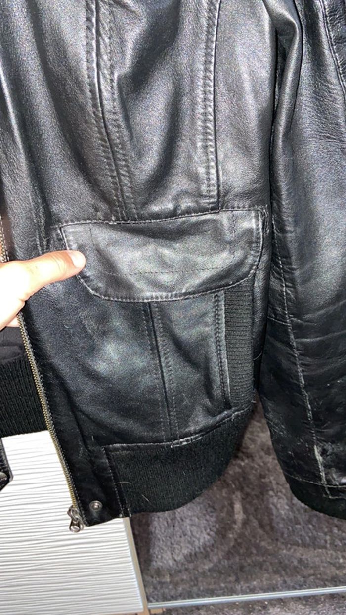 Veste cuir type perfecto Marque mango Quelques traces d’usure mais état général vraiment très bon Veste superbe à porter:-) Taille L