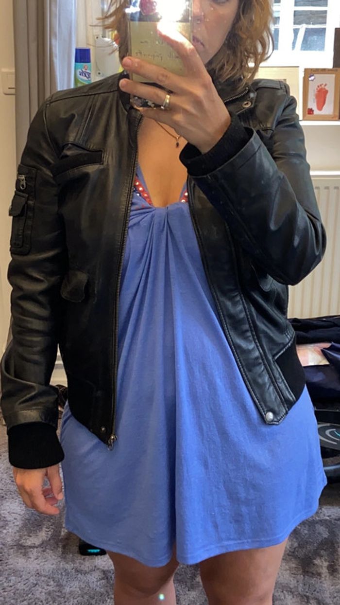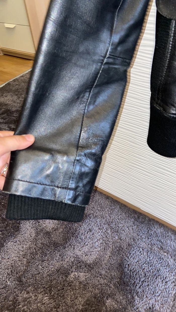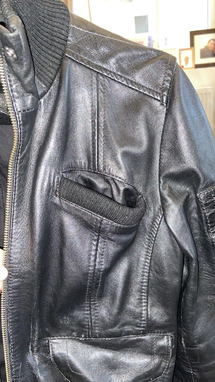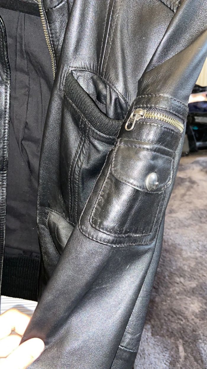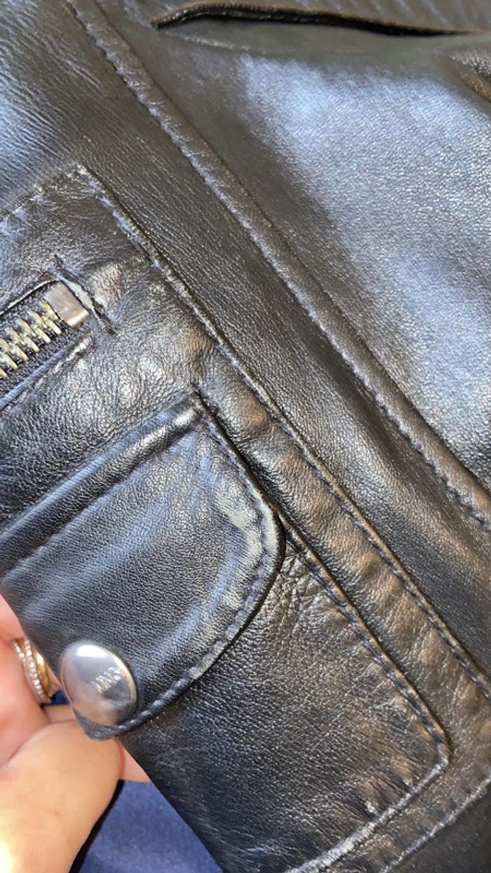 Veste cuir type perfecto Marque mango Quelques traces d’usure mais état général vraiment très bon Veste superbe à porter:-) Taille L