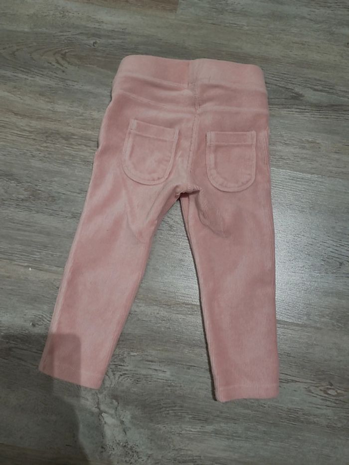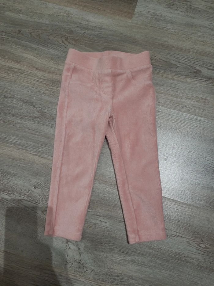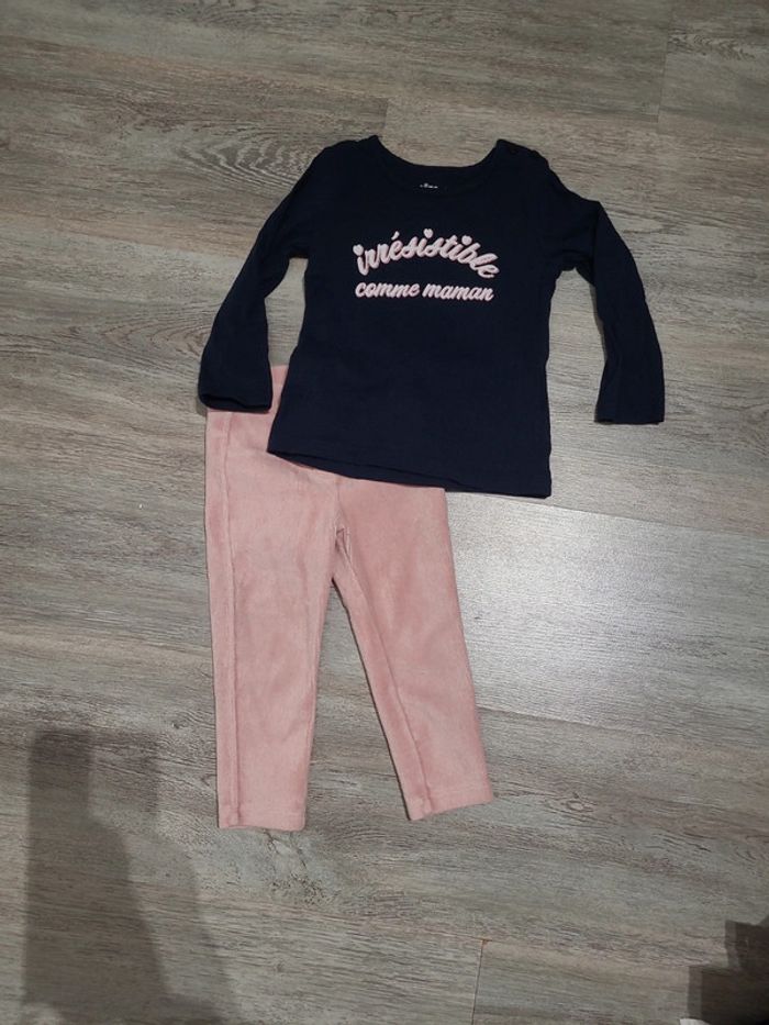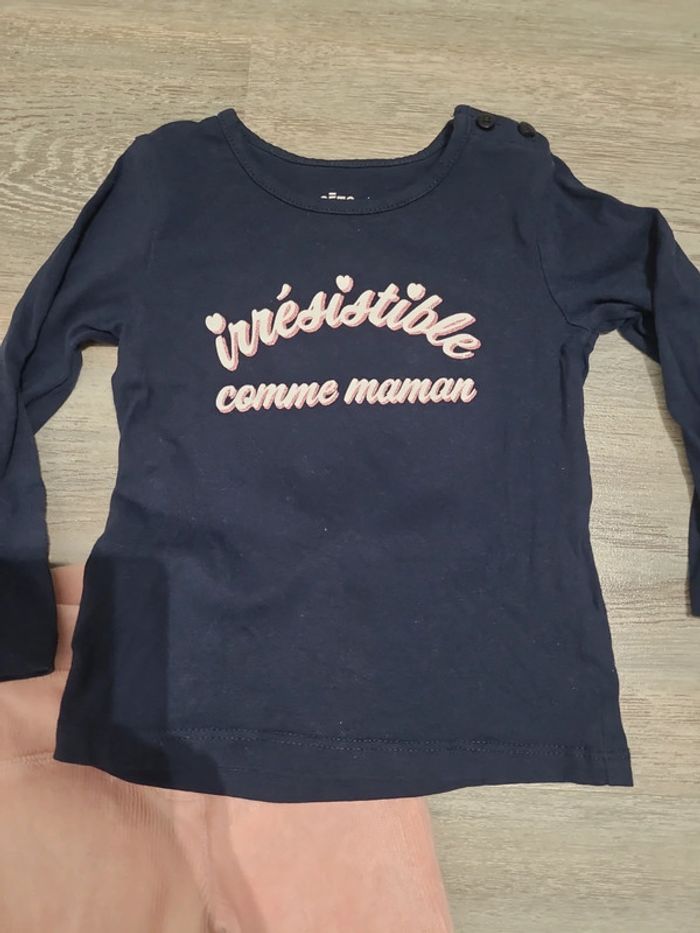 Ensemble comprenant 1 pantalon en velours rose taille élastique et 1 tee shirt manches longues bleu marine avec écriture à paillettes Taille 18 mois