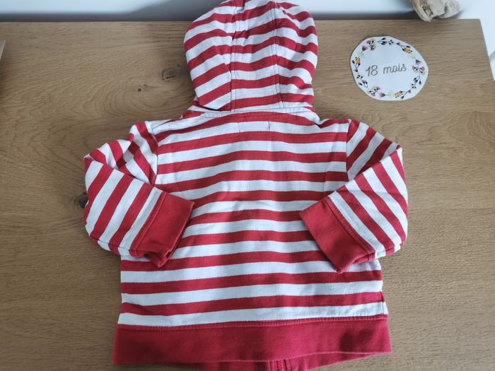Veste à capuche rayée rouge et blanc de la marque tissaia en taille 18mois. Elle a été portée mais reste en tres bon etat general.