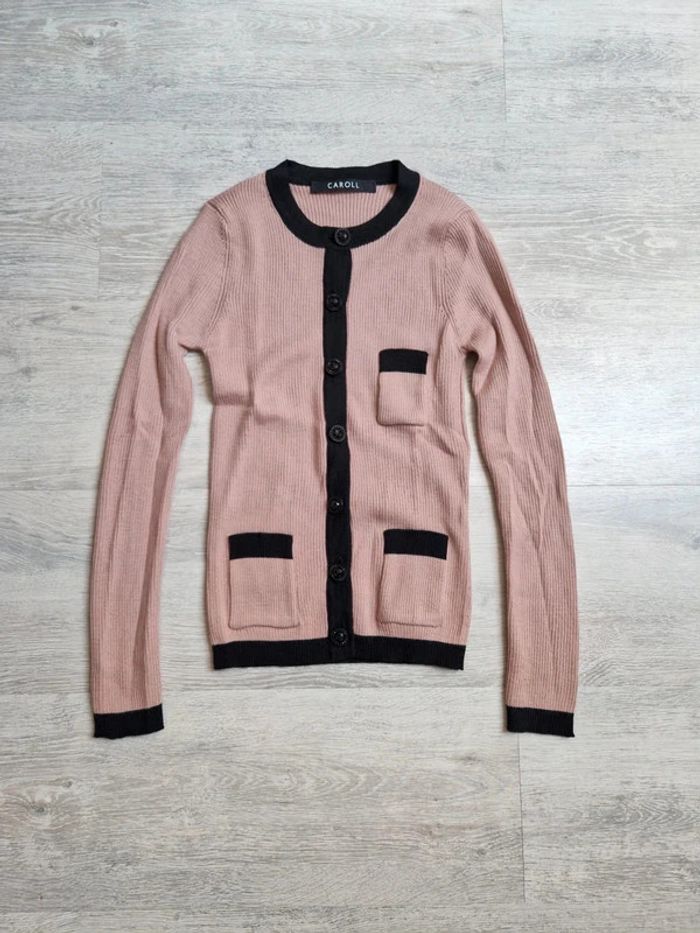 Très joli cardigan Caroll neuf Taille 34 #julilo7femme Noir et rose Les boutons sont magnifiques Le gilet contient 50% de laine mérinos