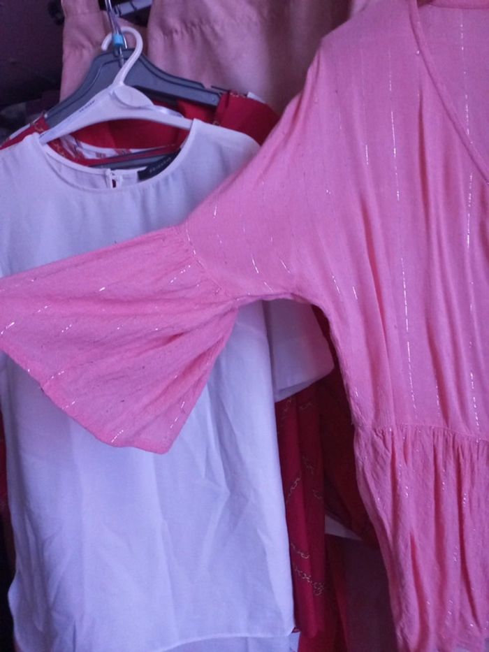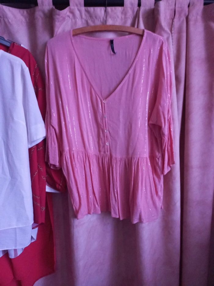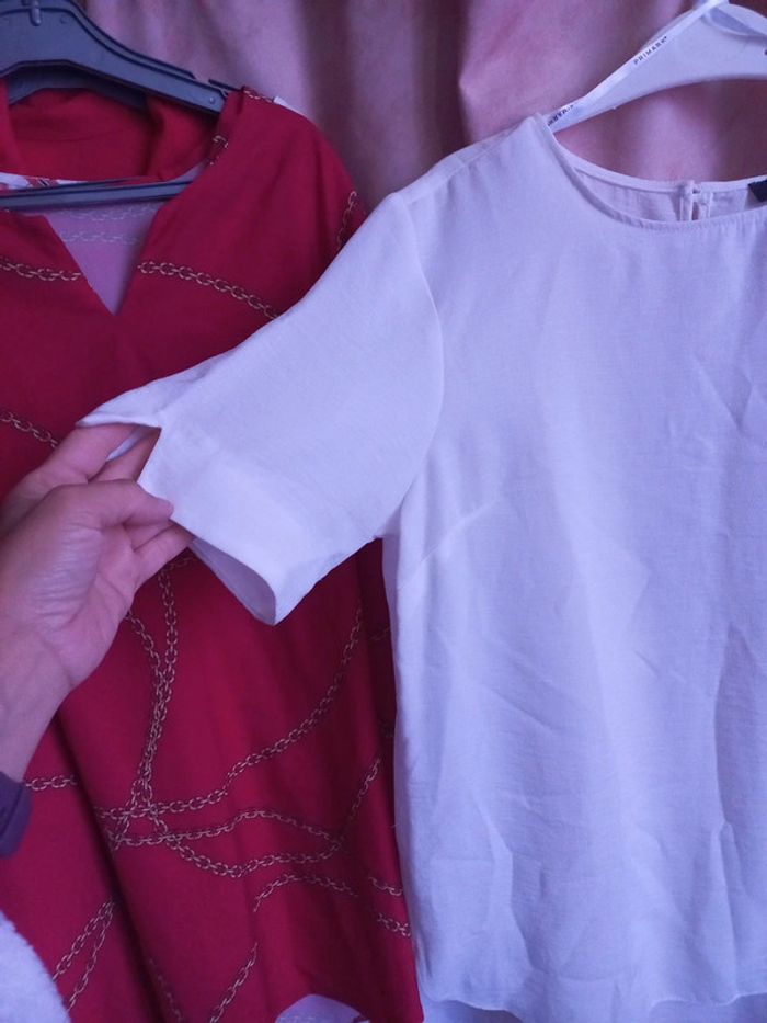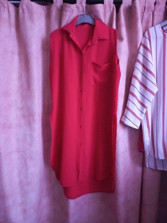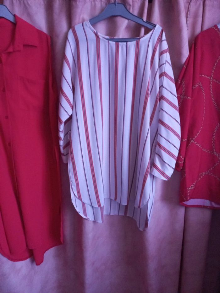 1 t-shirt blouse rose clair avec liseré argenté 1 tshirt blanc fluide primark 1 tshirt long (tunique) manche 3/4 rouge avec chaînette 1 tshirt long (tunique) manche 3/4 blanc rayé. Passant à ceinture mais je n'ai plus la ceinture. primark 1 chemise longue rouge sans manches ouverte sur les côtés. Tous sont en très bon état sauf le premier rose dont les liserés s'enlèvent. #lenkekefemme36