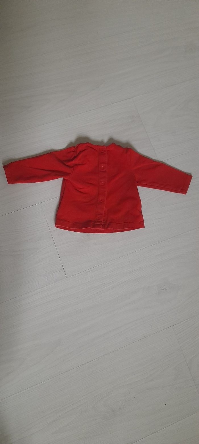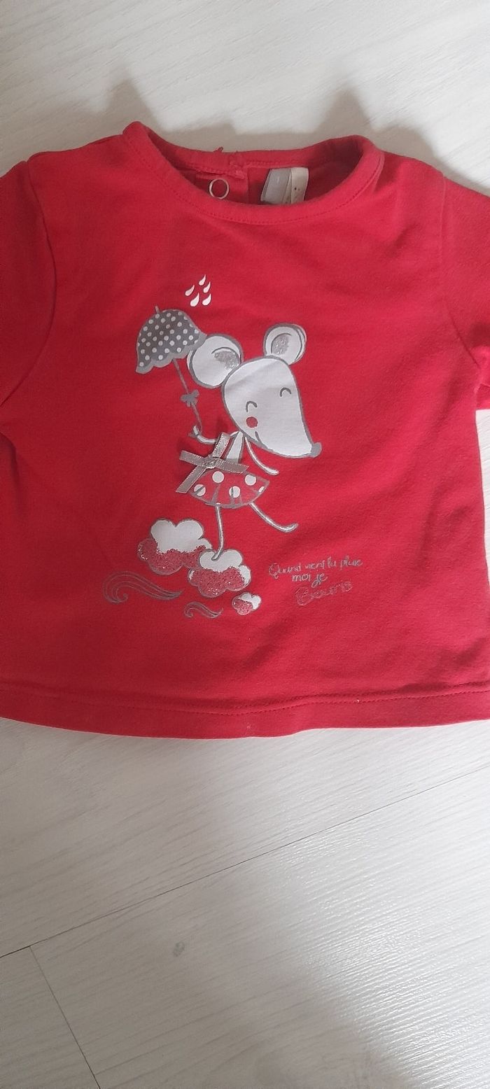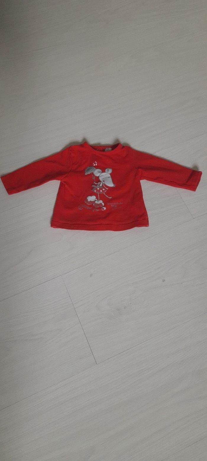 Haut T 1 moi Marque RICHESTRA BÉBÉ Couleur rouge avec motif souris sur le devant Manches longues Attache pressions dans le dos Très très bonne état