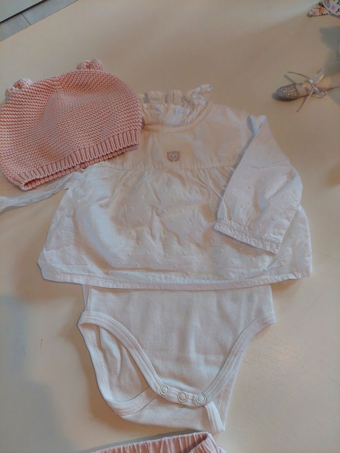 Ensemble 3 pièces Chemise blanche avec bodie intégré Pantalon rose velours Bonnet en laine avec Oreille Taille 3 mois Marque mon premier major