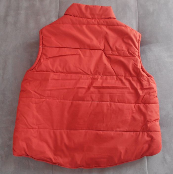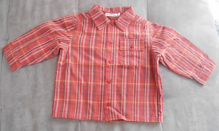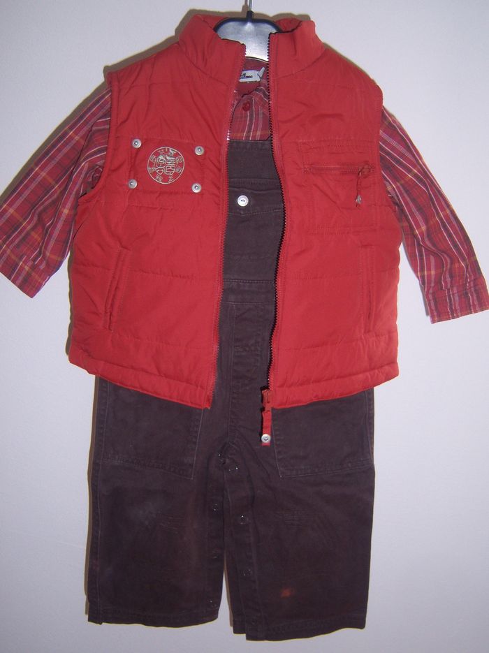 Ensemble 3 pièces pour garçon composé d'une chemise doublée manches longues rayée dans les tons rouges, d'une salopette marron et d'une doudoune sans manche rouge Ouverture par pressions de la salopette au niveau des bretelles, des côtés et de l'entrejambe Salopette réglable sur 2 hauteurs Taille 18 mois - 81 cm Marque Tape à l'œil Très bon état mais une petite décoloration rouge sur le bas de jambe gauche de la salopette (cf photos)