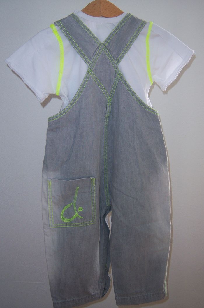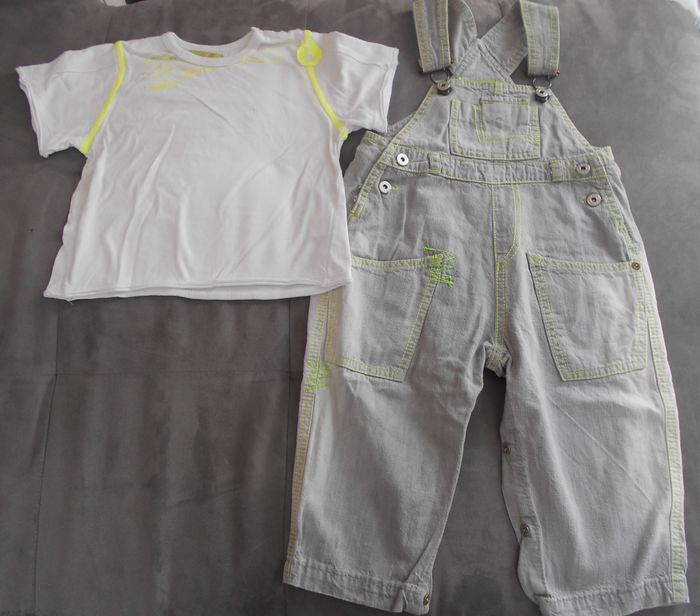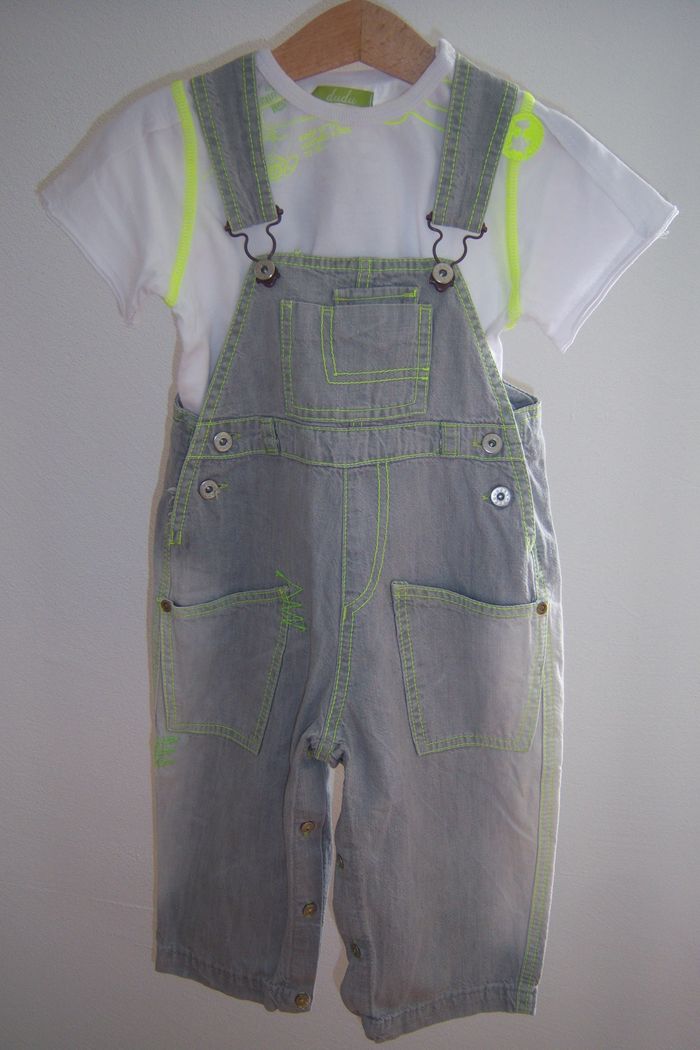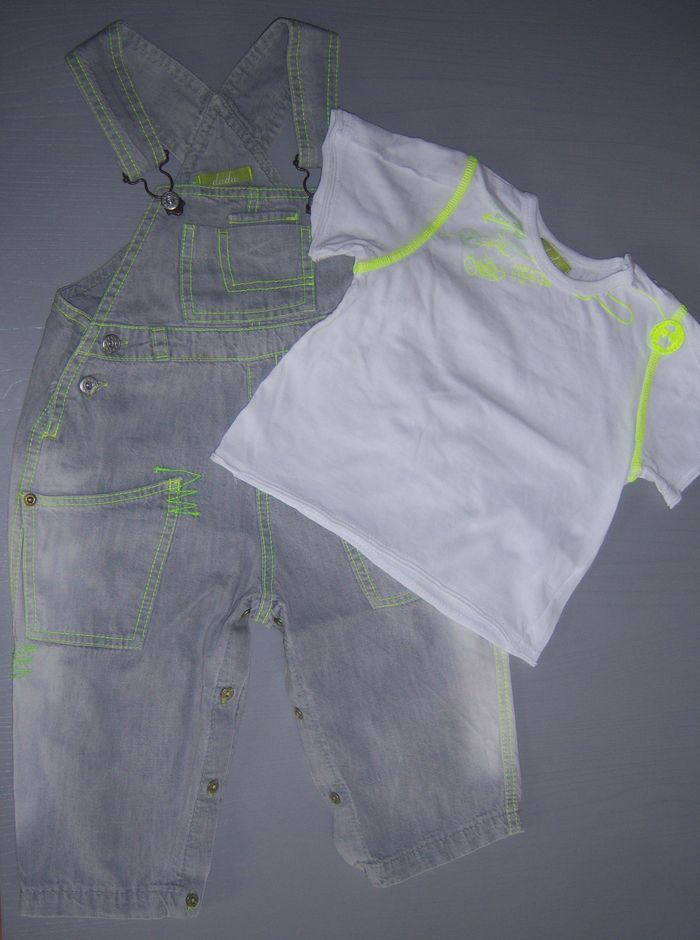 Ensemble garçon composé d'un T-shirt manches courtes blanc et jaune fluo et d'une salopette grise en jean avec coutures jaunes et vertes fluo T-shirt ouverture par 3 boutons dans le cou Salopette ouverture devant, côtés et entrejambes, hauteur réglable Taille 18 mois Marque Dudu Très bon état