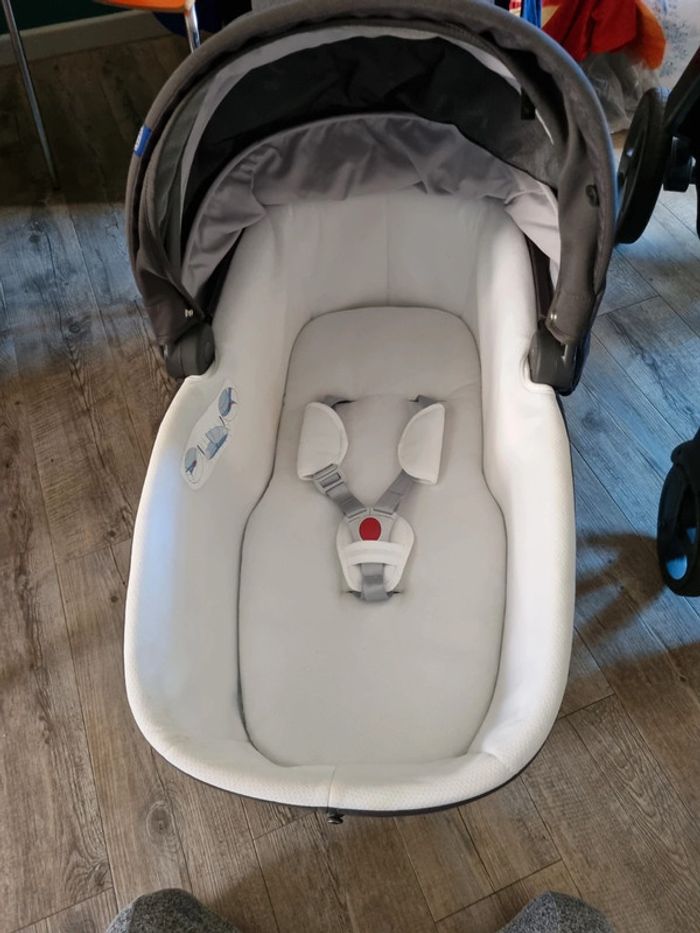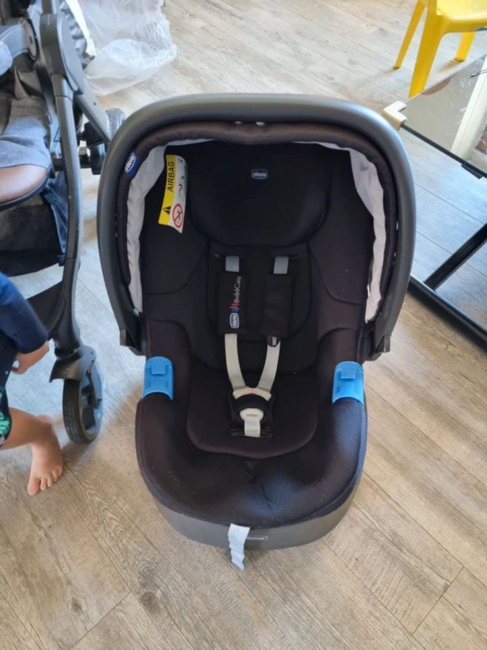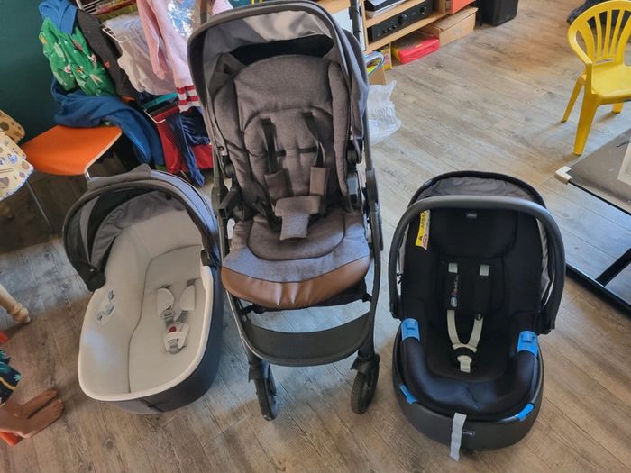 Poussette Chicco Trio Pousette Trio très bon état . Très confortable pour bébé et à manier . - Siege auto ( 0 accident ou choc ) avec socle - Nacelle - Pousette ( quelques égratignures sur le côté ) Entièrement laver et désinfecter Avec Notice . Remise en main propre sur l'air Toulonnaise