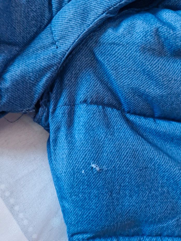 Doudoune 4/5 ans Les manches sont amovibles via une fermeture éclaire L'une des manches présente un petit accro (voir photo) La couleur s'est légèrement enlevée sur la fermeture (voir photo)