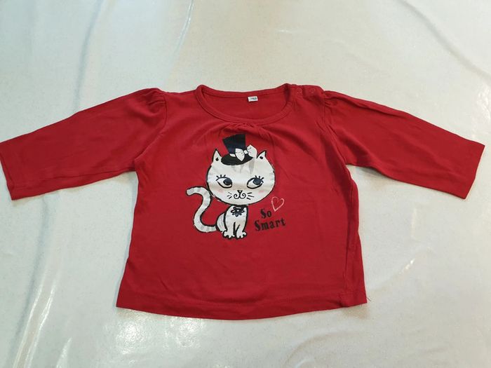 Tee-shirts manche longue rouge avec petit chat 🐱. Taille 18 mois. Très bon état.