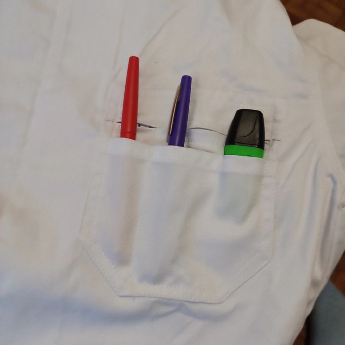 Largeur au niveau des aisselles 50 cm, longueur 64 cm, taille élastique et 4 poches, plus 3 petites pour les stylos.