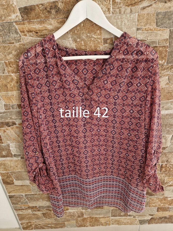1 haut blouse rouge Bordeau gris fonce voile léger taille 42 marque Camaieu - photo numéro 1
