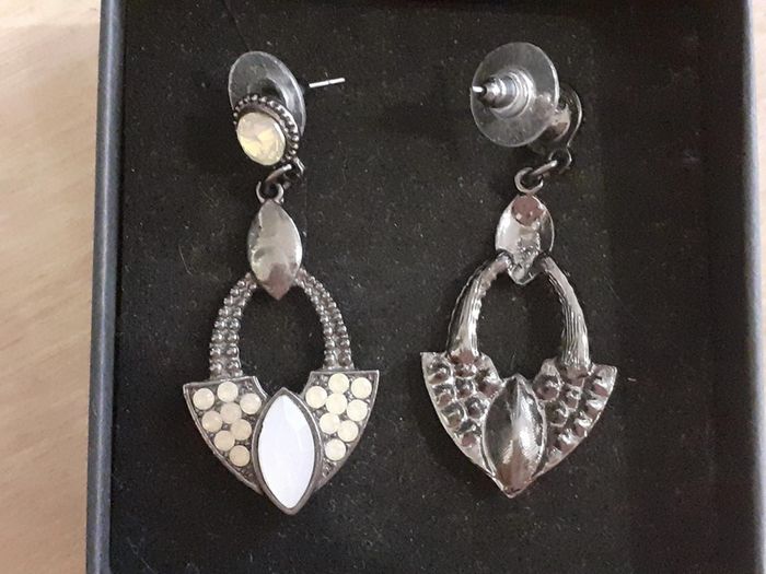 Boucle d'oreille fantaisie acier noir, pierre jaune et zircon jaune. Mesure environ 5cm En très bon état Envoi rapide, soigné et sécurisé.
