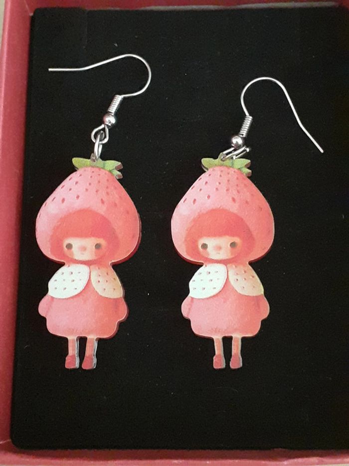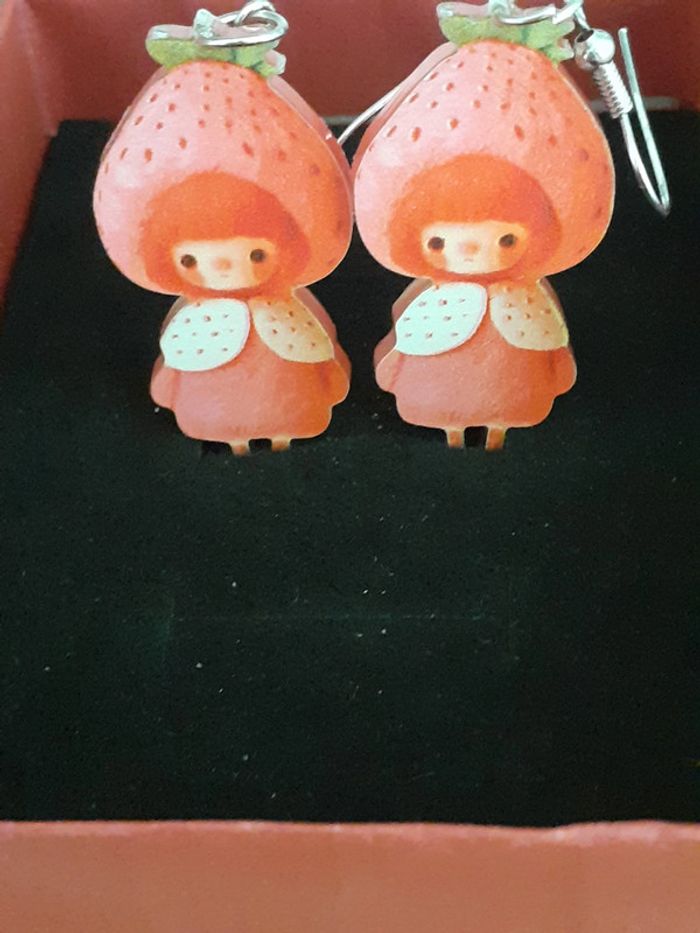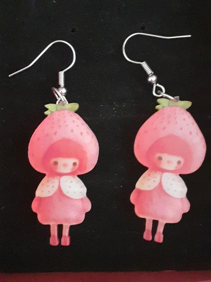 Boucle d'oreille poupée Fraise en 2D. Matière plastique dur. Mesure environ 4cm. En excellent état Envoi rapide, soigné et sécurisé.