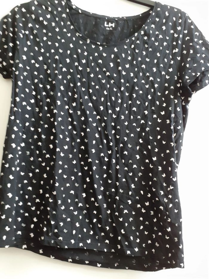 T-shirt femme noire avec papillons blanc et argenté. Manche courte. Col rond. La Halle. Largeur d'aisselle à aisselle : 54cm environ Largeur à la taille : 50cm environ Longueur : 62cm environ Taille XL. En très bon état Envoi rapide, soigné et sécurisé.
