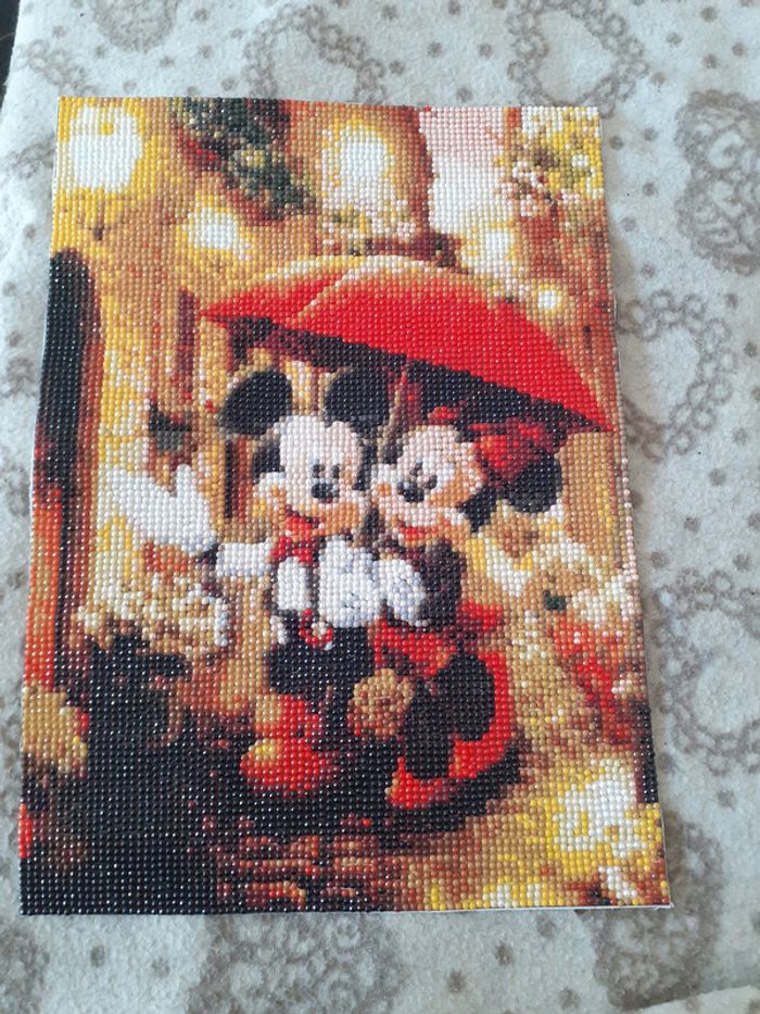 Diamond painting Mickey et Minnie fait, 30x40cm. Envoi rapide, soigné et sécurisé.