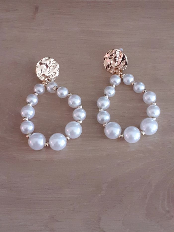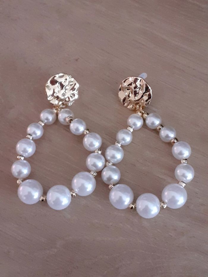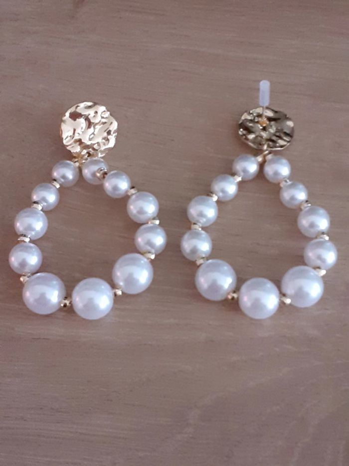 Boucle d'oreille en perle blanche et dorée. Mesure environ 6cm. En excellent état Envoi rapide, soigné et sécurisé.