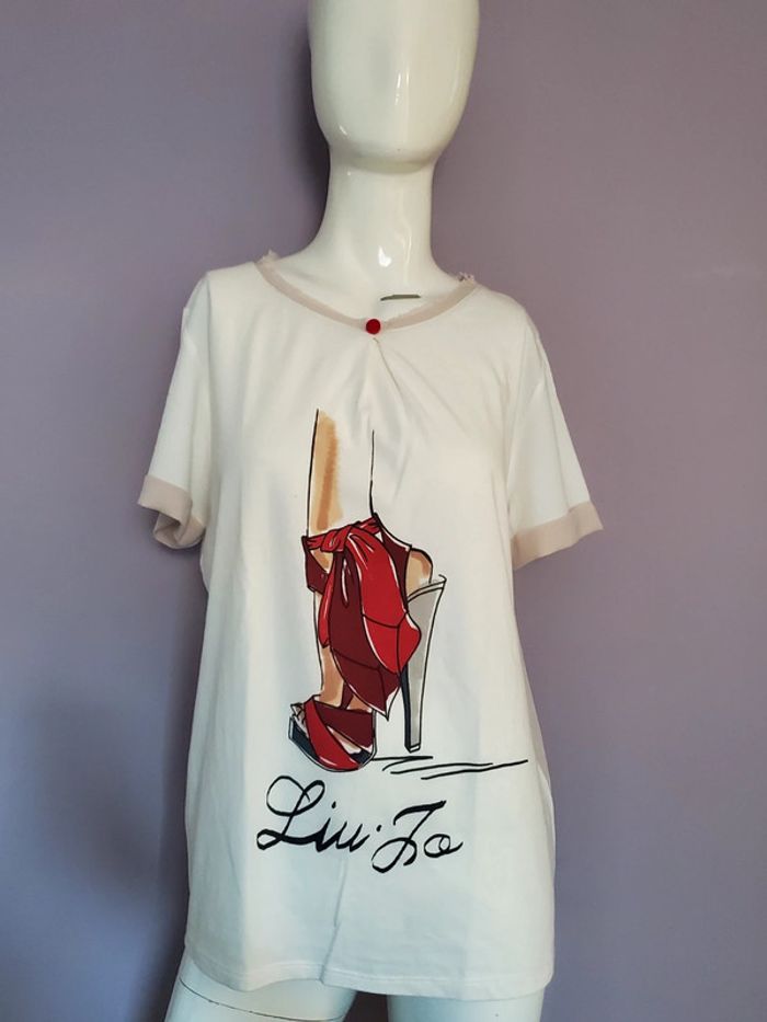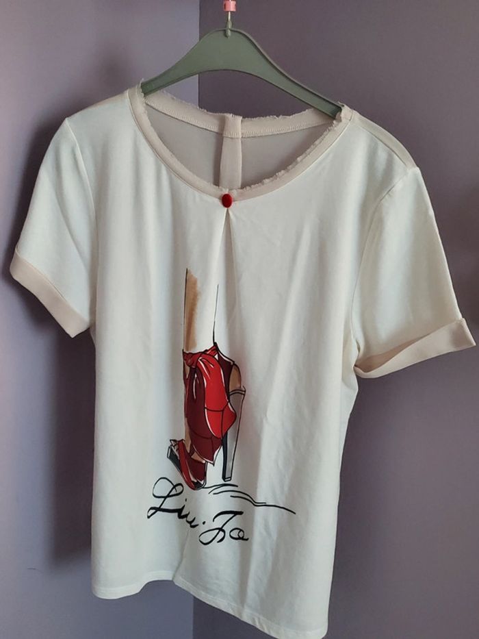 Tshirt manches courtes. Blanc écru motif chaussure rouge à talon. Dos transparent, légèrement cintré. Taille 42.