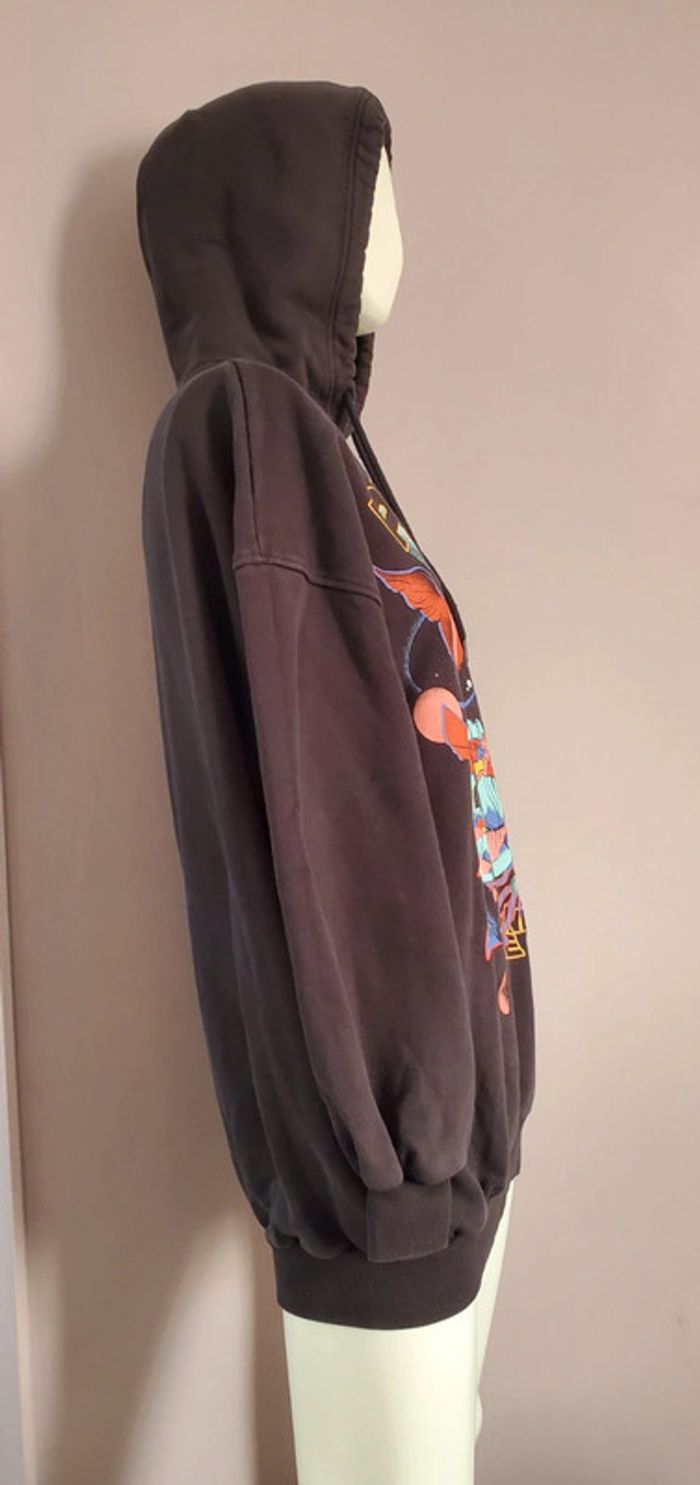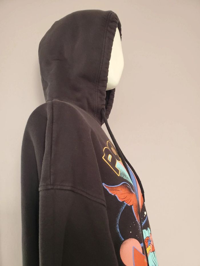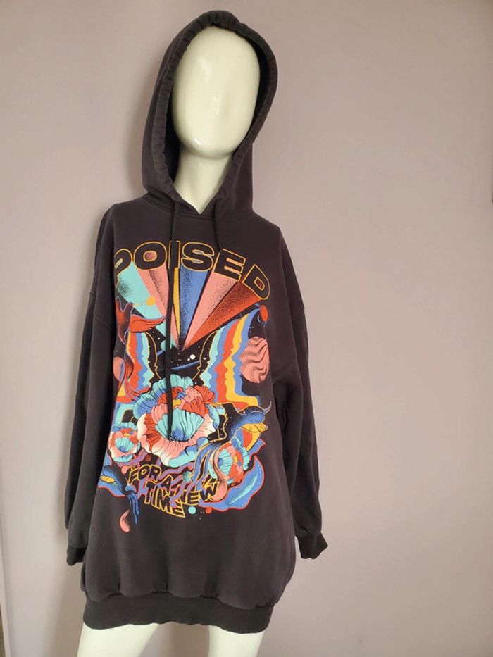 Sweat-shirt long à capuche noir imprimé. Marque Bershka. 66 % coton, 34 % élasthanne. Taille XS.