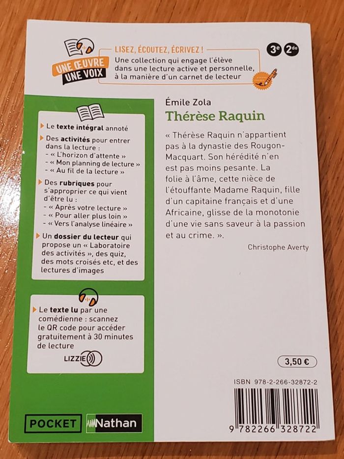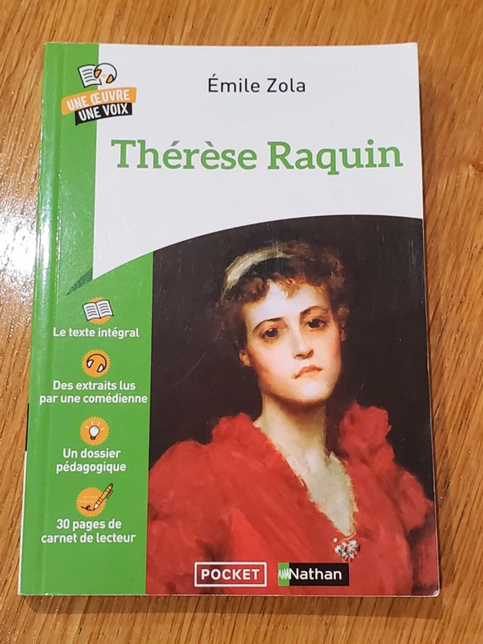 Lisez, écoutez, écrivez ! Pocket et Nathan s'associent et proposent "Une oeuvre, une voix", une collection qui engage l'élève dans une lecture active et personnelle, à la manière d'un carnet de lecteur. Thérèse a été élevée par sa tante dans le but d'épouser son cousin, un homme au tempérament maladif. Bientôt, elle ne supporte plus cette vie cloîtrée, ni ce sinistre passage du Pont-Neuf où Mme Raquin installe sa mercerie. Toute sa sensualité refoulée s'éveille au contact de Laurent, un peintre raté dont elle devient la maîtresse. Les amants décident de noyer le mari. L'âpreté, la sexualité, le crime. Entre roman noir et tragédie, l'implacable réalisme social et humain de Zola est à l'œuvre.